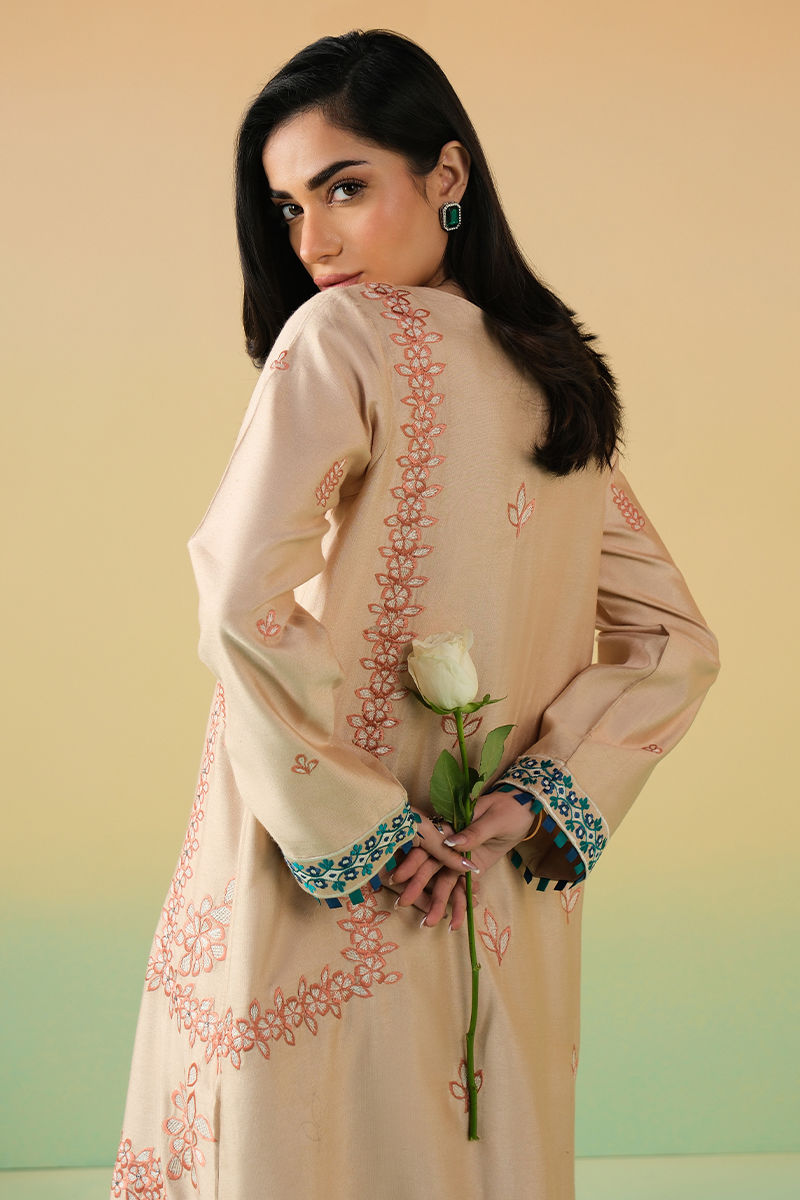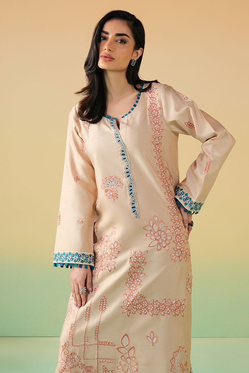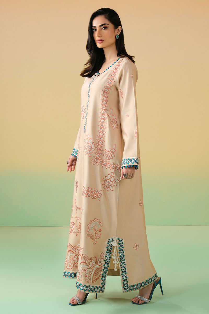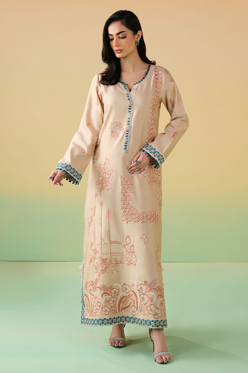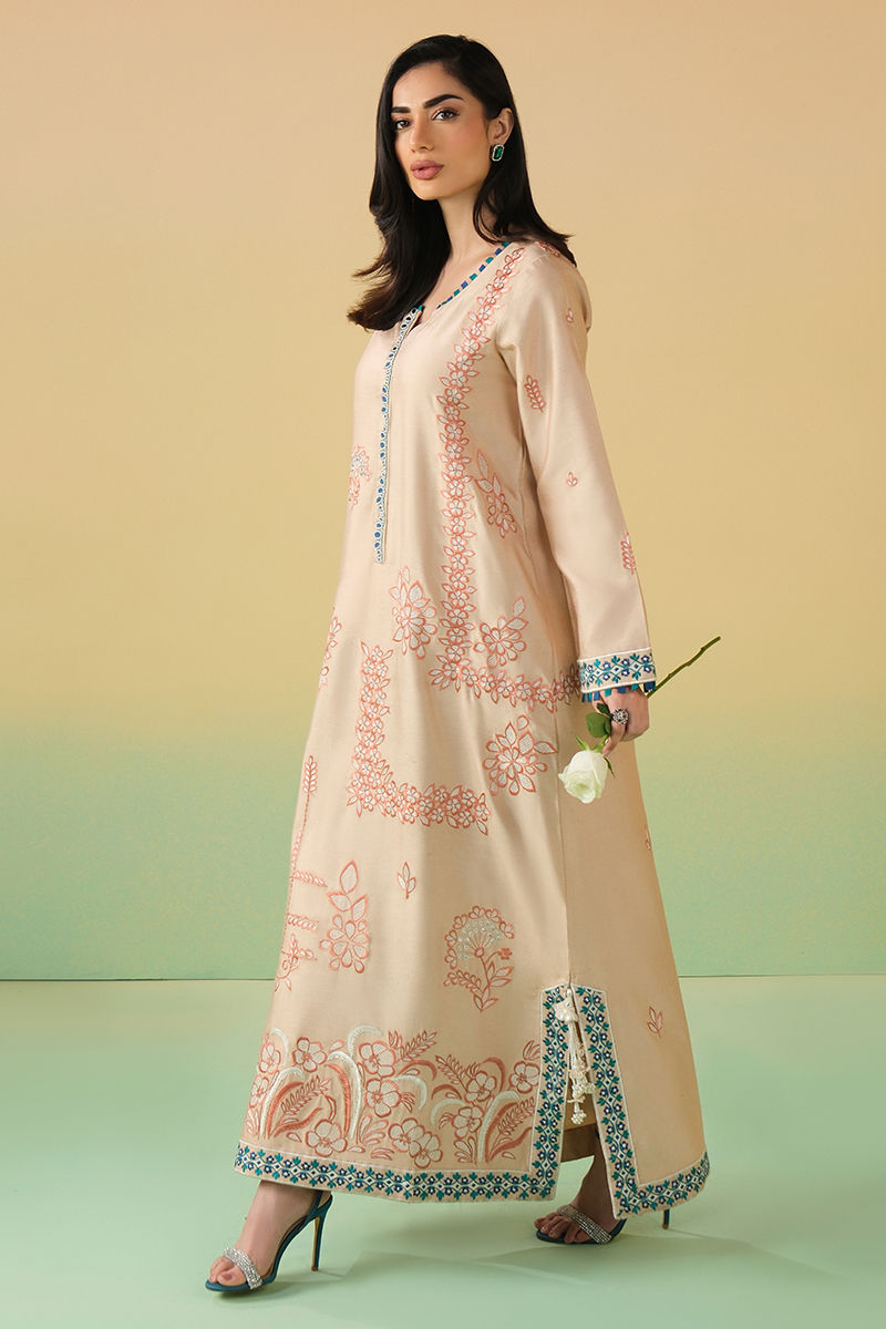 This sand-toned kaftan is adorned with intricate coral threadwork that blooms across the silhouette in artful floral patterns. The elongated cut is elevated with a striking embellished neckline, finished with teal accents and tassels. Balanced yet expressive, this piece is designed for festive occasions where statement details meet refined tailoring - bold in artistry, effortless in wear.