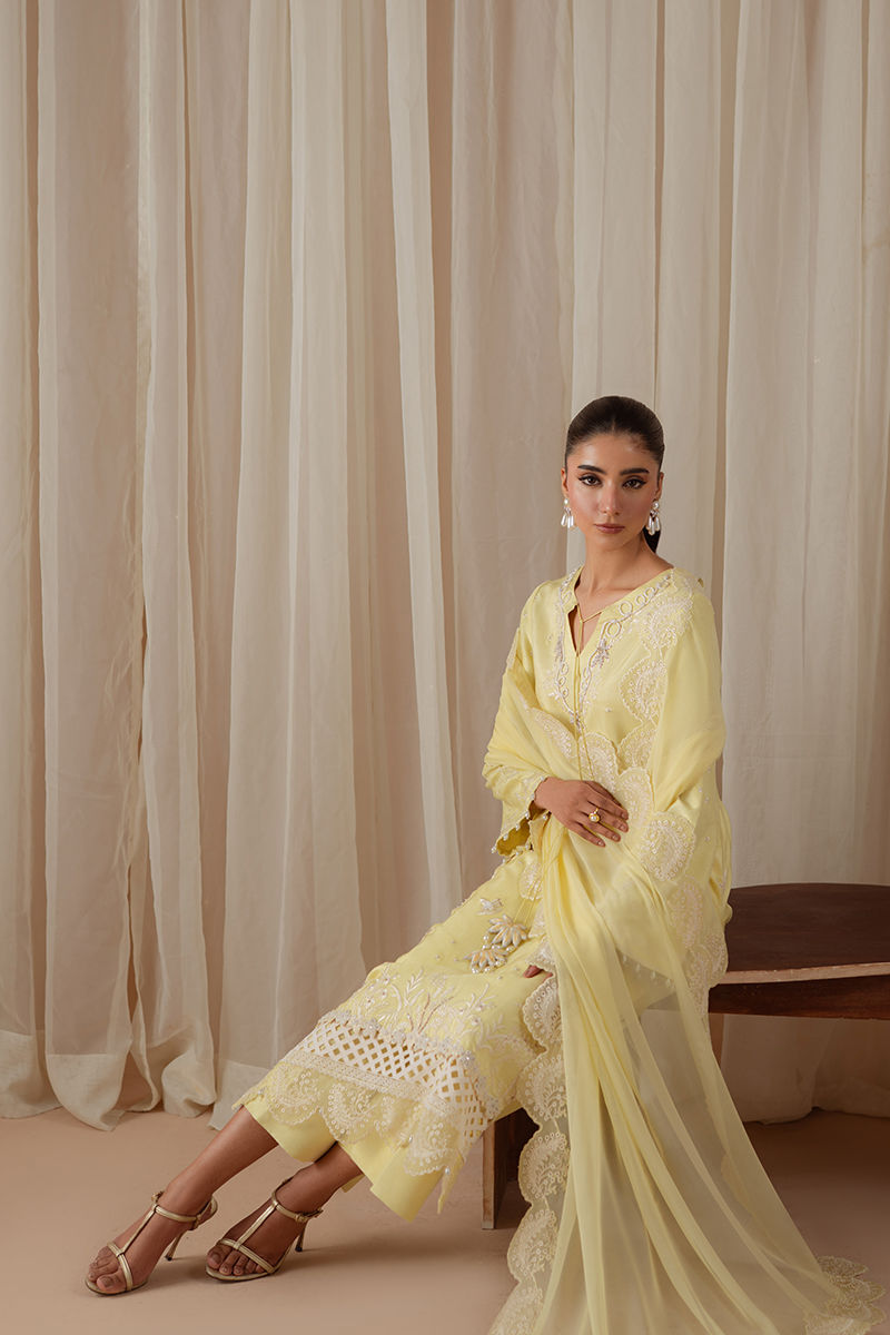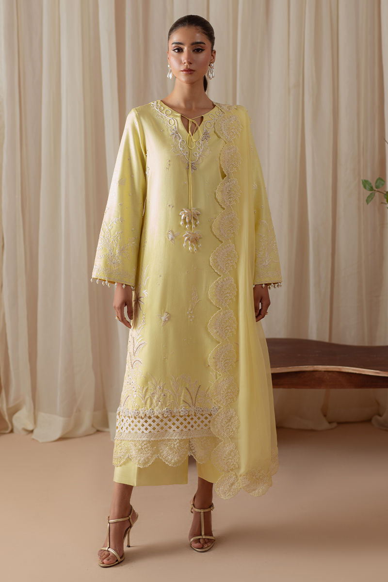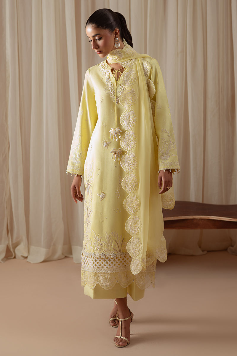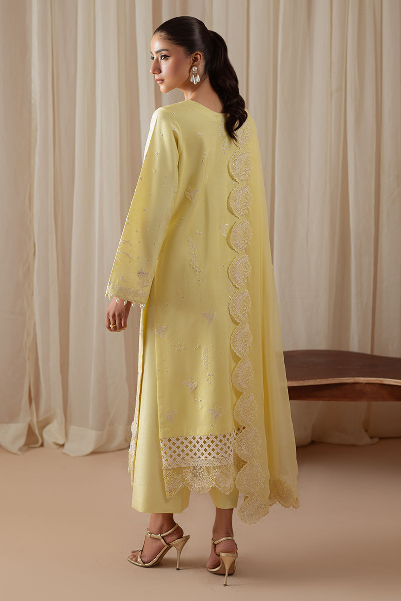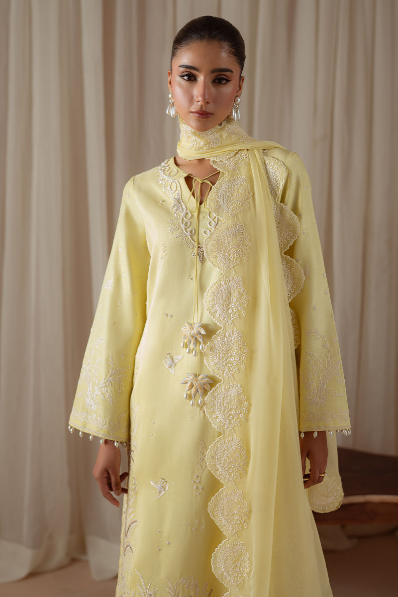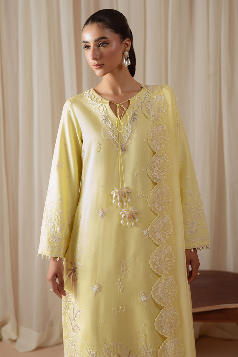 Soft and ethereal, this pale yellow raw silk shirt and pant duo captures understated femininity. The relaxed silhouette is adorned with a painterly botanical and floral embroidery and butterfly motifs for a whimsical, elegant finish.