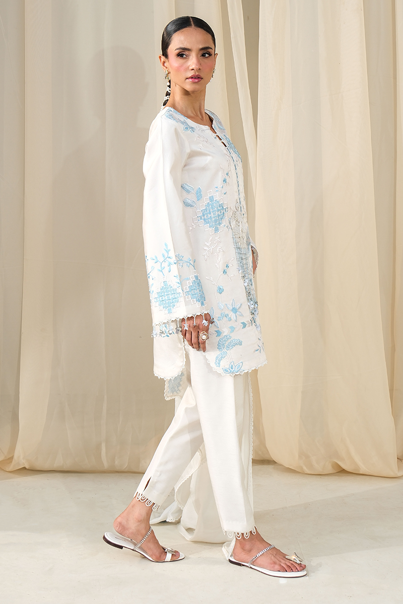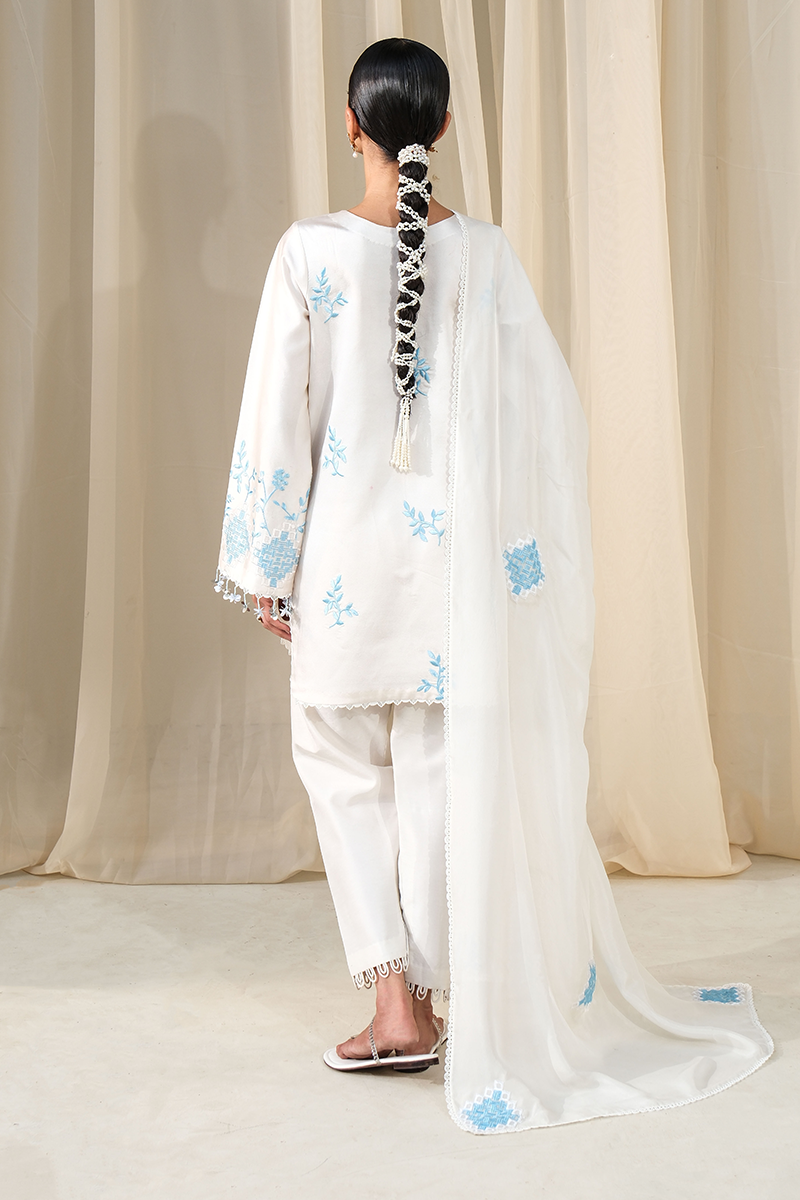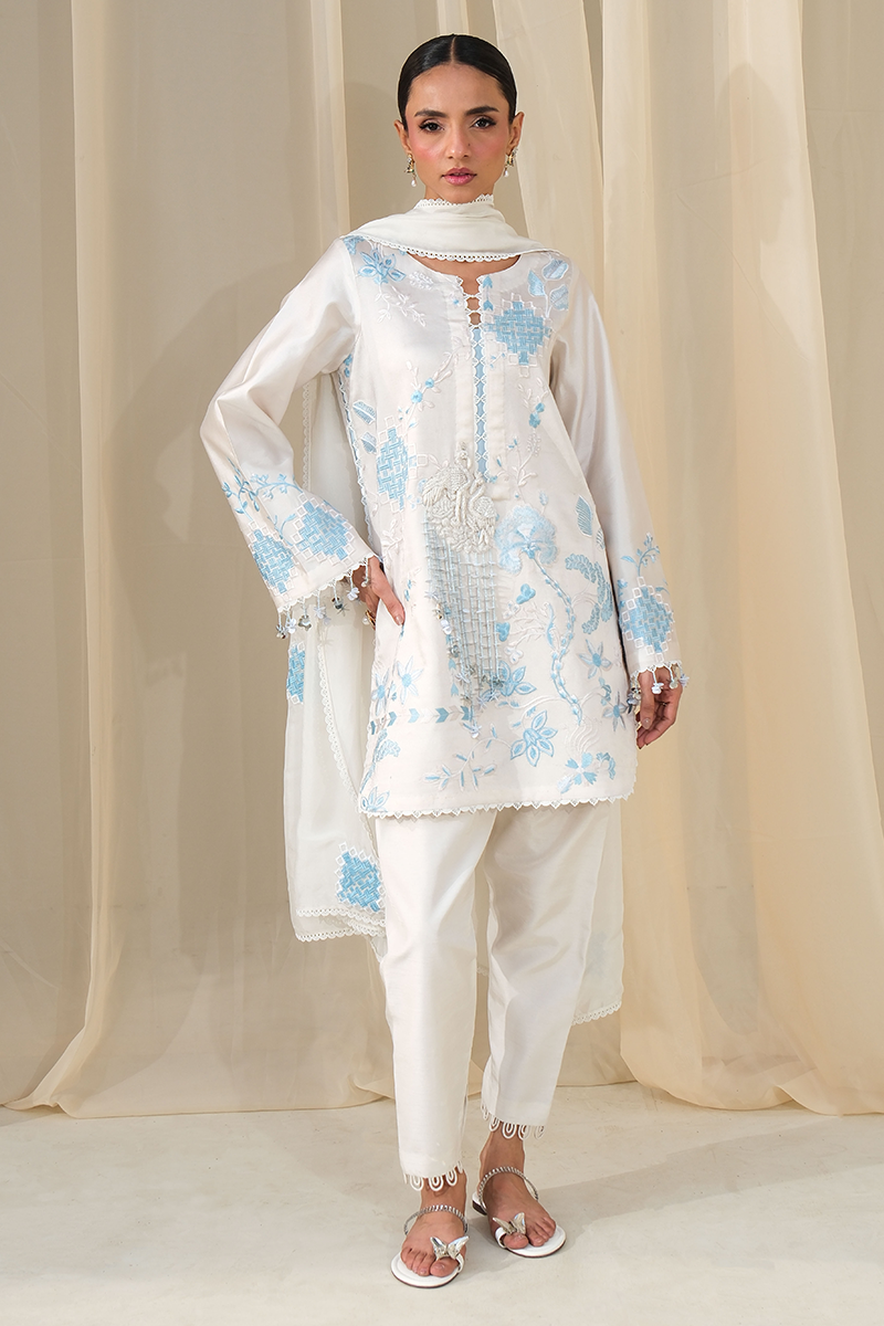 An ethereal blend of ivory and ice blue, Ayla features intricate embroidery with a delicately embellished swan motif, accented with contemporary hangings. Paired with a sleek slim shalwar and a silk dupatta finished with embroidery and lace detailing, this look is the epitome of graceful elegance.