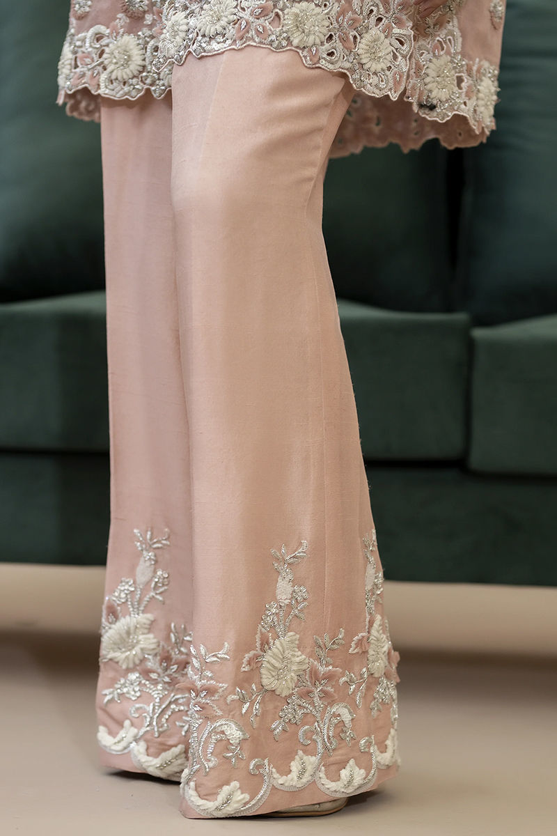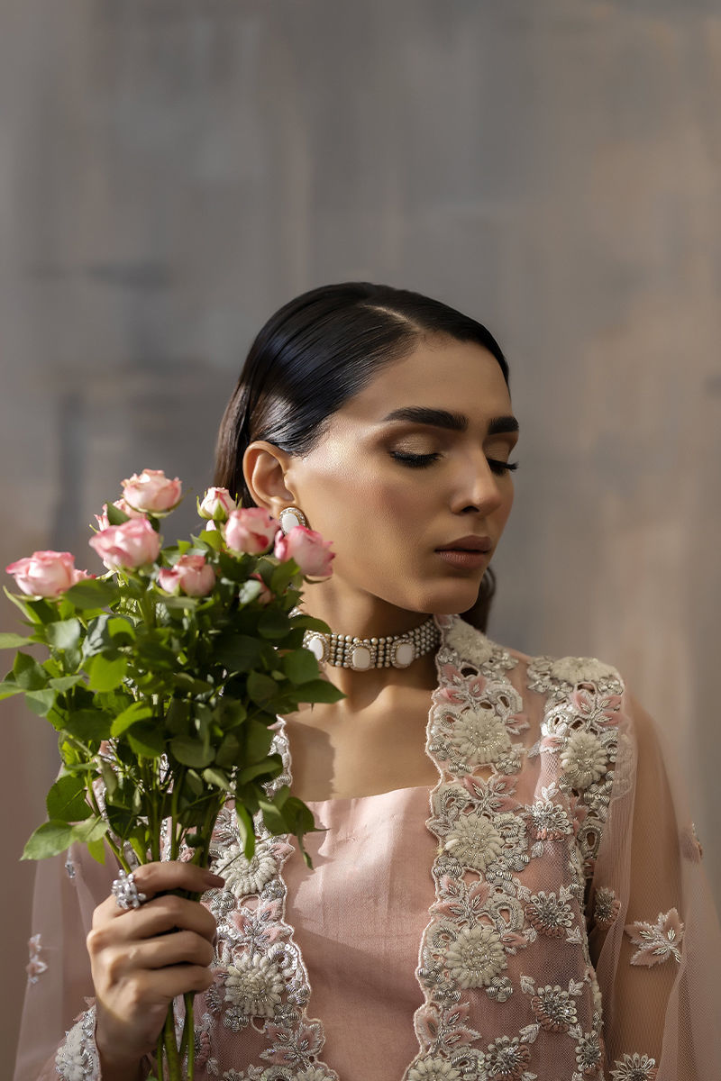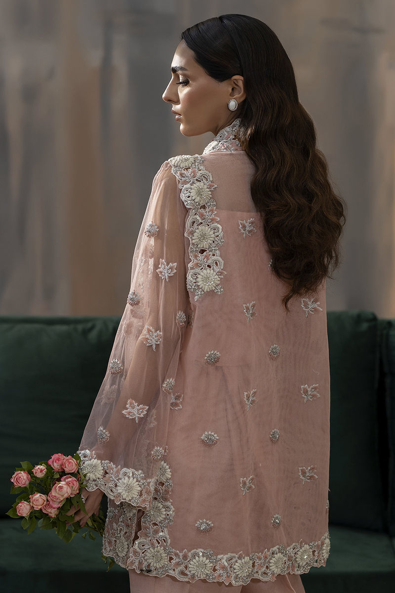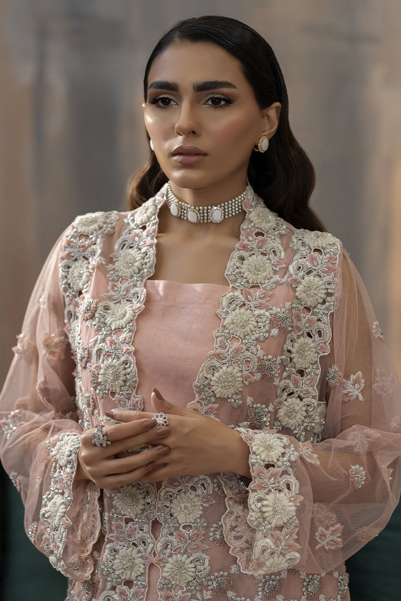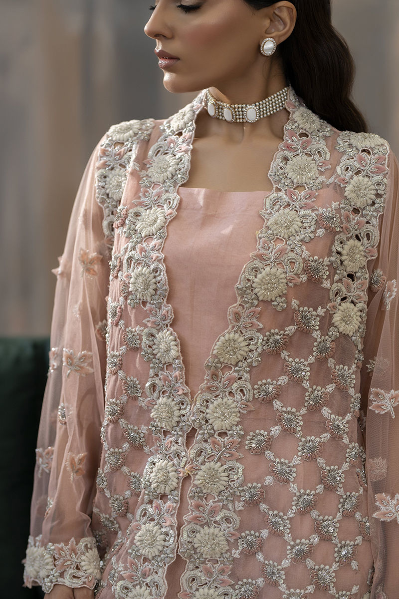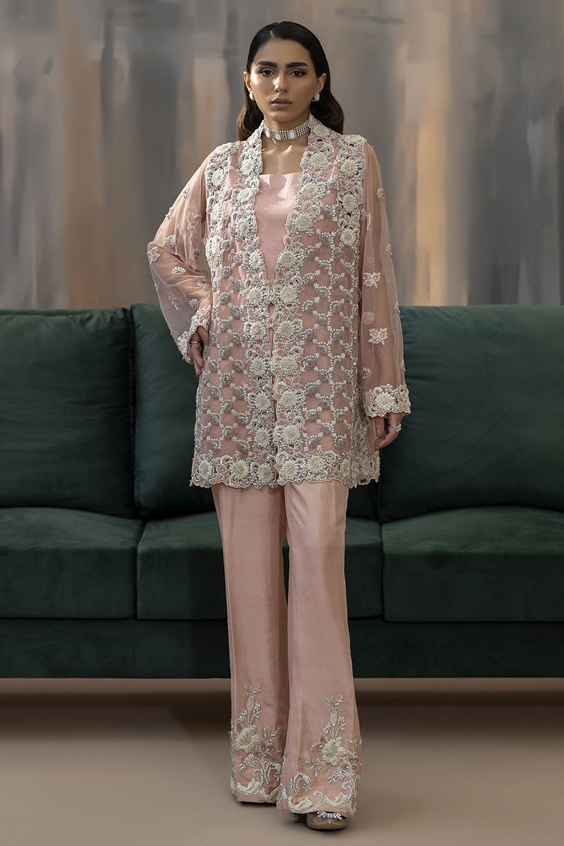 Embrace elegance with a modern twist in our pink formal wear ensemble. Featuring a sleek, embellished net jacket adorned with delicate silver work, this look combines classic Eastern grace with contemporary style. Perfect for making a statement this wedding season! rawsilk embellished pants and inner is included.