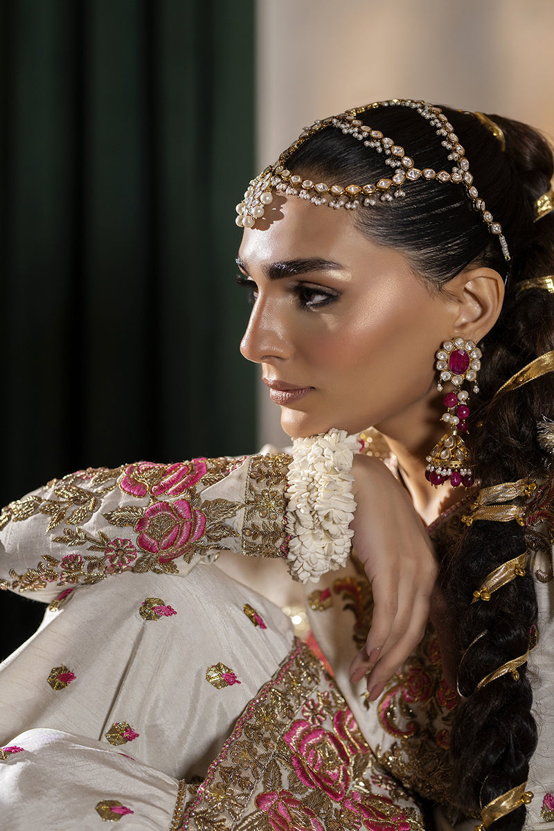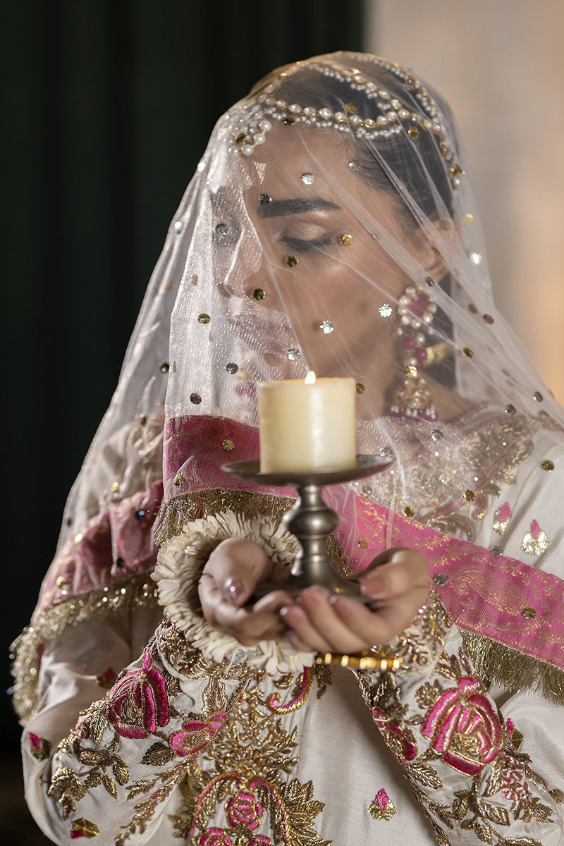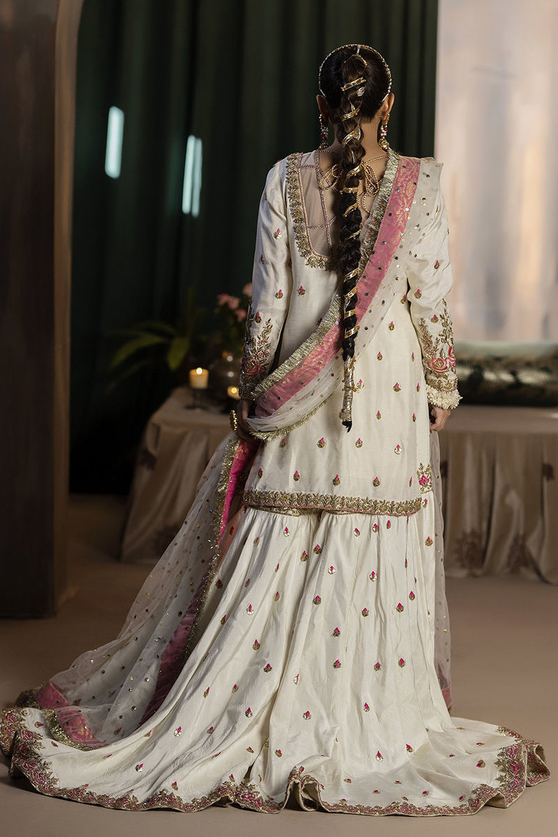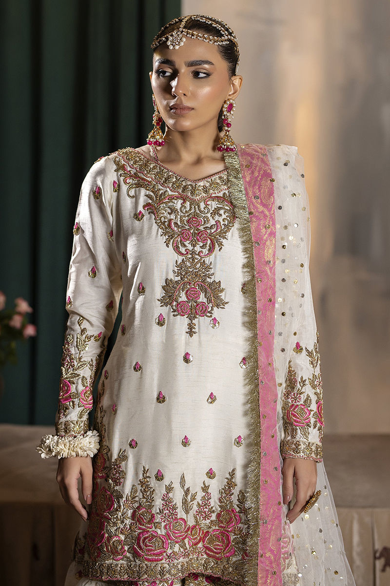 Blending tradition with contemporary elegance! This stunning white and pink gharara is paired with a beautifully embellished short shirt that captures the essence of festive glamour. The intricate gold work adds a touch of luxury, while the delicate net dupatta completes the look with grace. Perfect for celebrations where every detail shines!
