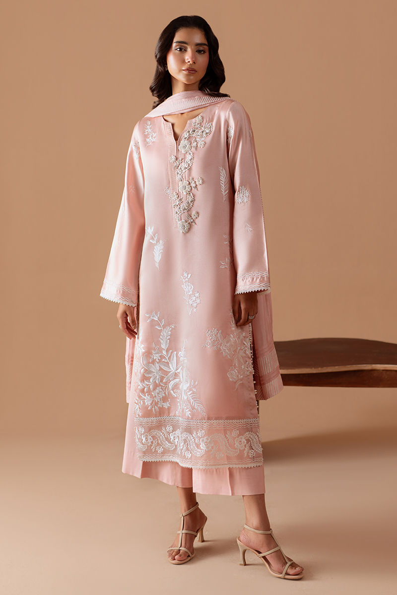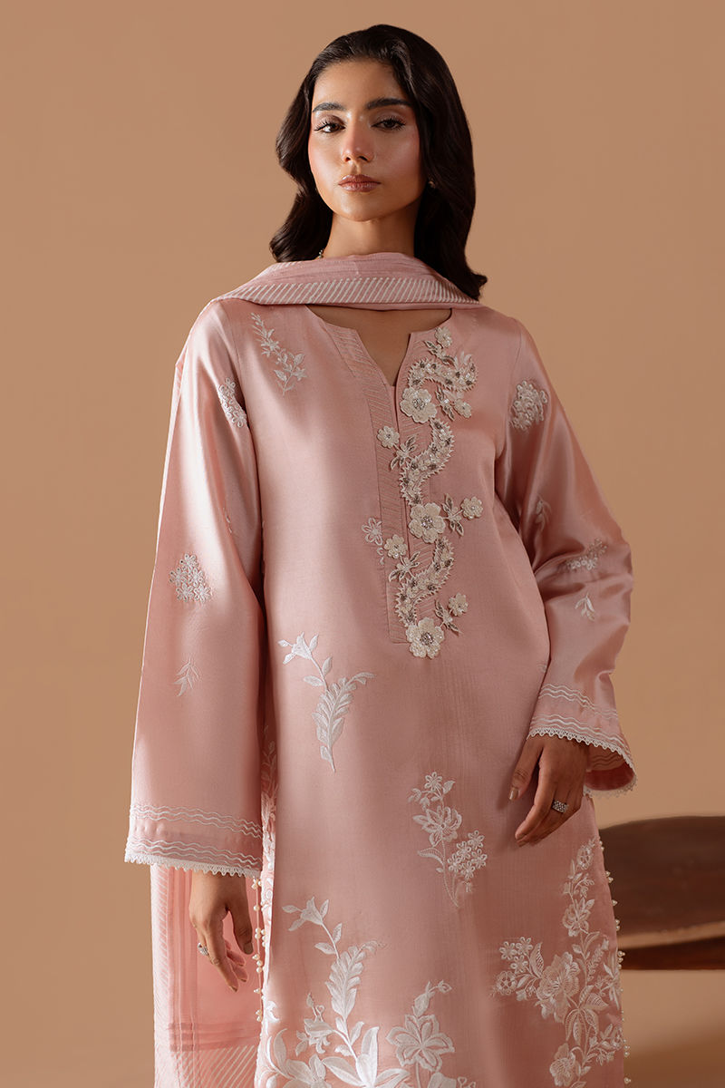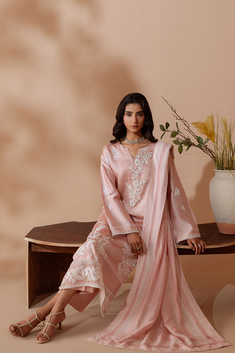 Soft, feminine, and effortlessly elegant — this blush three-piece is made to turn heads. The tissue silk shirt drapes beautifully with a subtle sheen, highlighted by delicate embroidery that adds elegant charm. Paired with rawsilk pants and finished with a flowing silk dupatta that brings movement, grace, and a touch of fun. Perfect for festive days, intimate celebrations, and moments worth dressing up for.