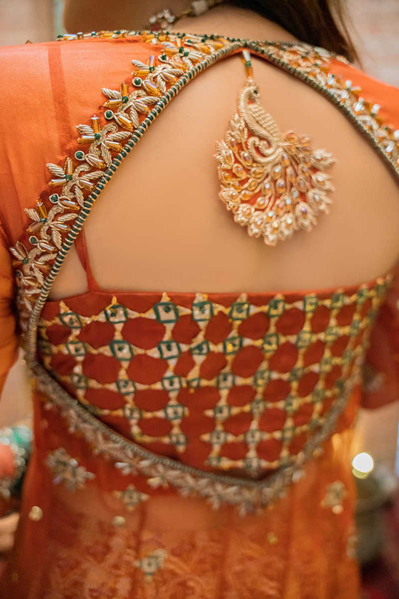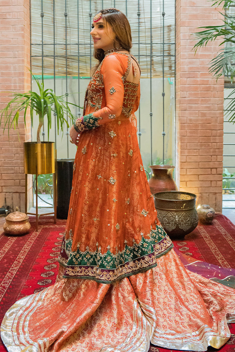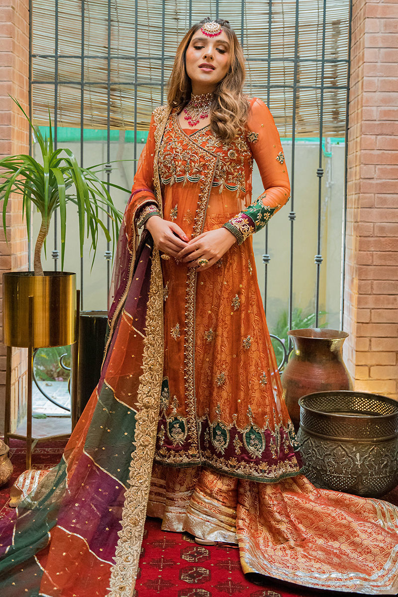 Dil Nasheen dances in our organza based angrakha flourished with gora, dabka and zardozi embellishments. Styling it with our banarsi dhaka gharara underneath ; Gorgeous net dupatta with gota work and a one-sided border to complete the look with grace.