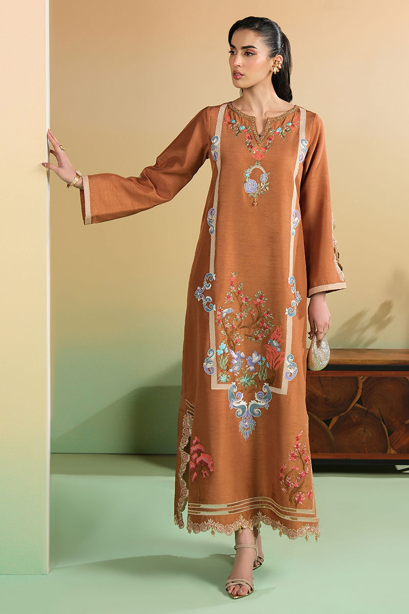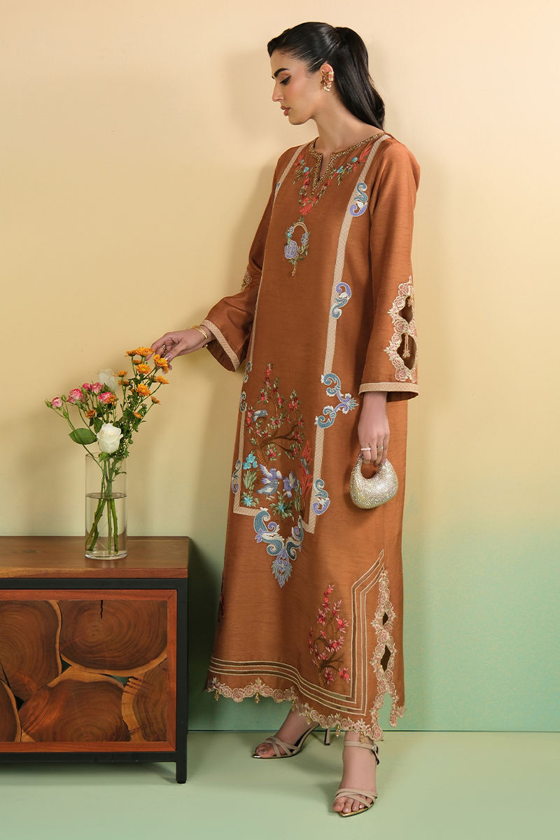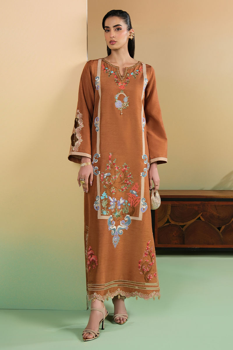 Bold luxury is awarded to this mocha kaftan. The embellished neckline, applique embroidery and beaded tassel trim all lend to an image of class and grace.