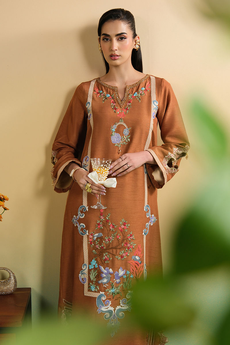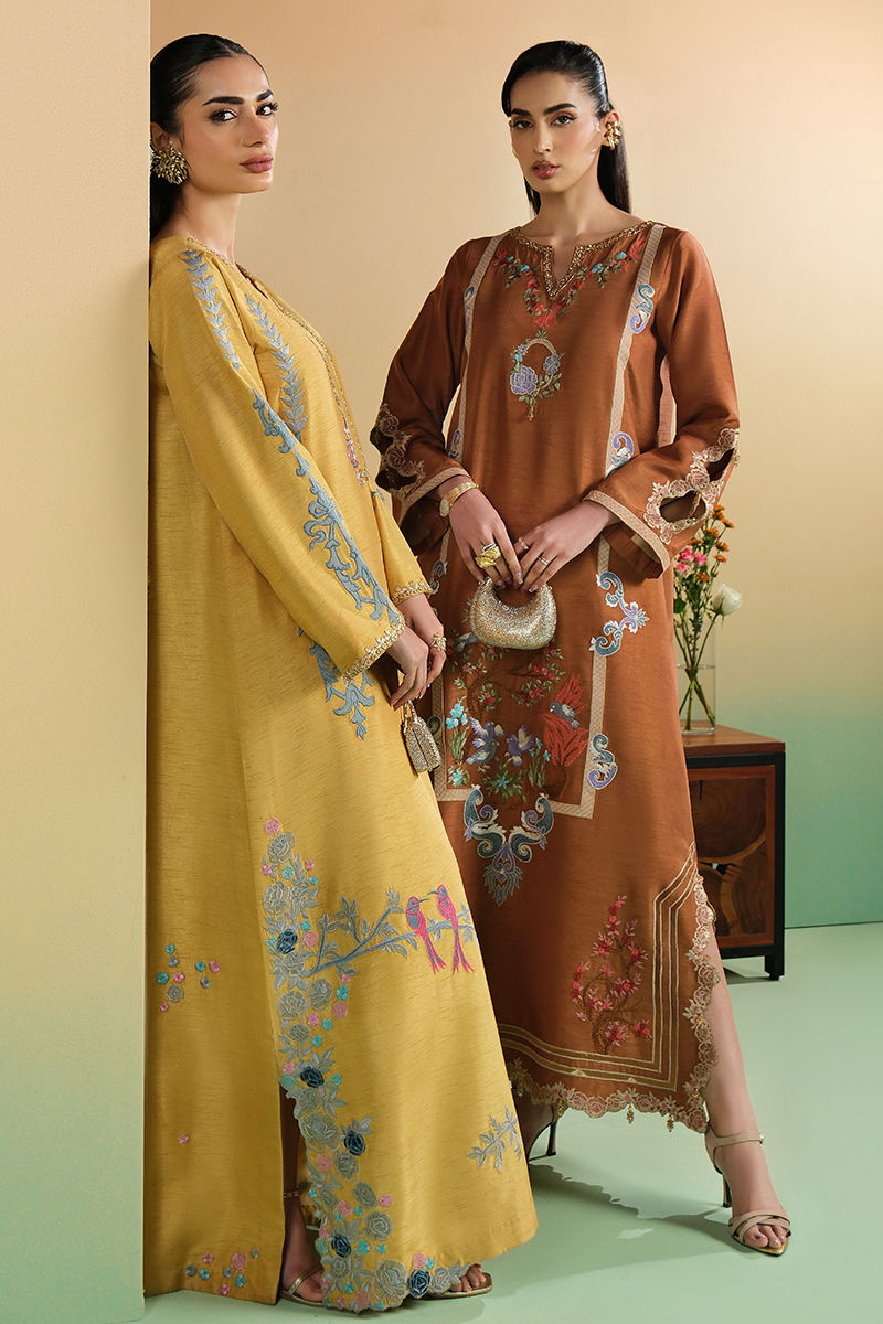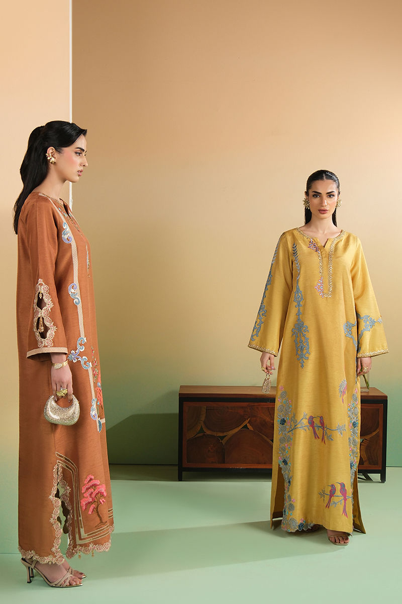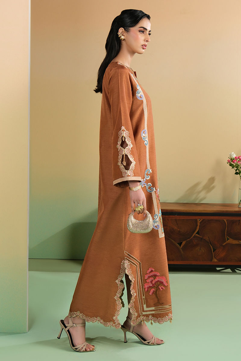 Bold luxury is awarded to this mocha kaftan. The embellished neckline, applique embroidery and beaded tassel trim all lend to an image of class and grace.
