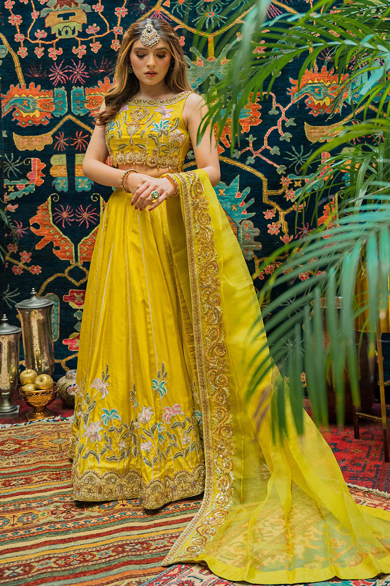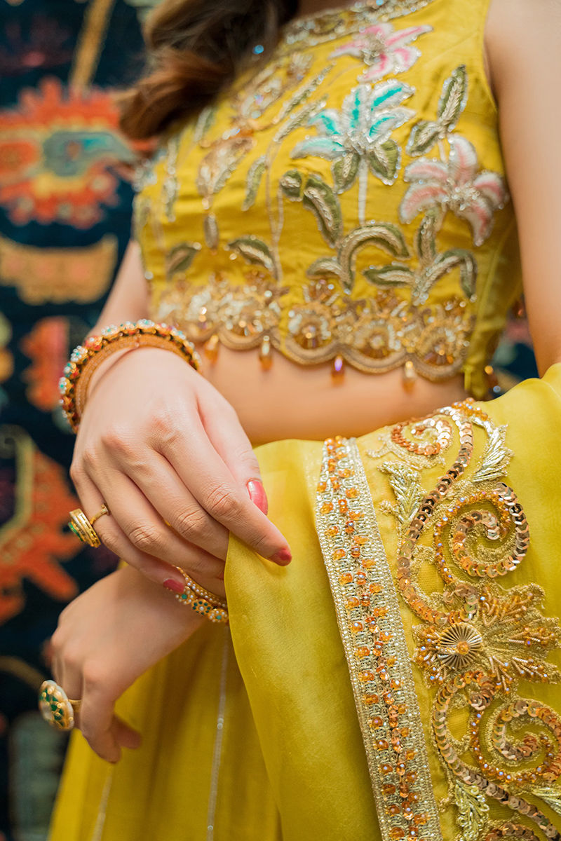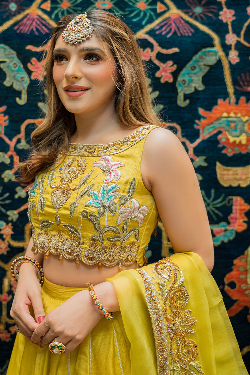 Built upon Korean raw silk, Gul e Rana dresses in an exclusive lehnga choli which is adorned with semi-precious stones making the dress feel more magical than ever. It has effortlessly been worked on using different techniques of gota work along side pitta, resham and dabka enhancements. Paired with a stunning organza dupatta with Sitara sprayed in the center, Gul e Rana is finally ready to step into the world.