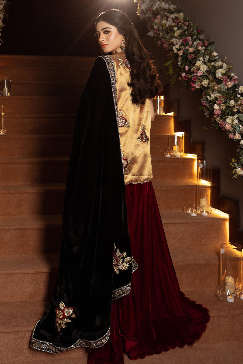 Jamawar choli with embellished front open hand worked shirt. It is paired with velvet heavy cora, dabka and embroided worked shawl. The complementing velvet sharara adds the glam quotient.
