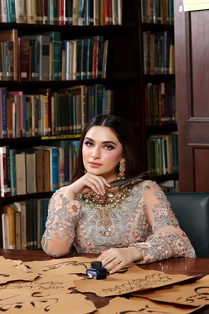 Shirt: The peachish pink gown is embellished with handmade dabka, naqshi, coloured sequins, stones, crystal and pearl work.Lehnga: Plain Lehnga to complete the lookDupatta: Net with handmade borders.Pouch: Dyed and embellished to complete the look.
