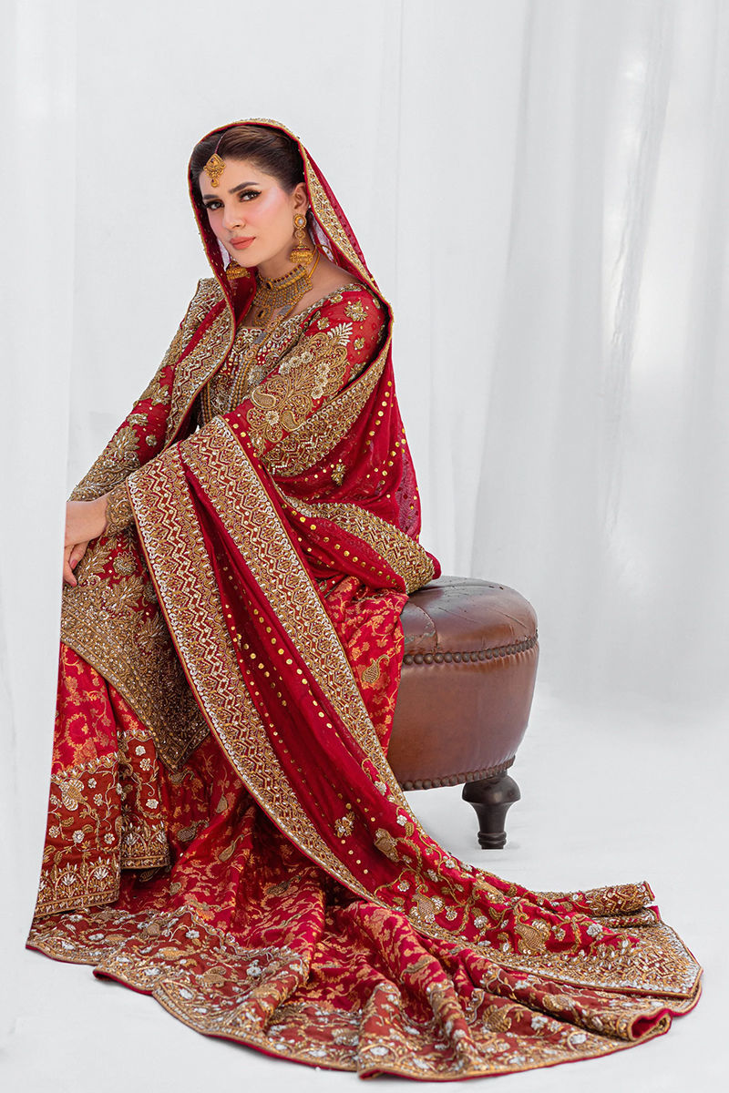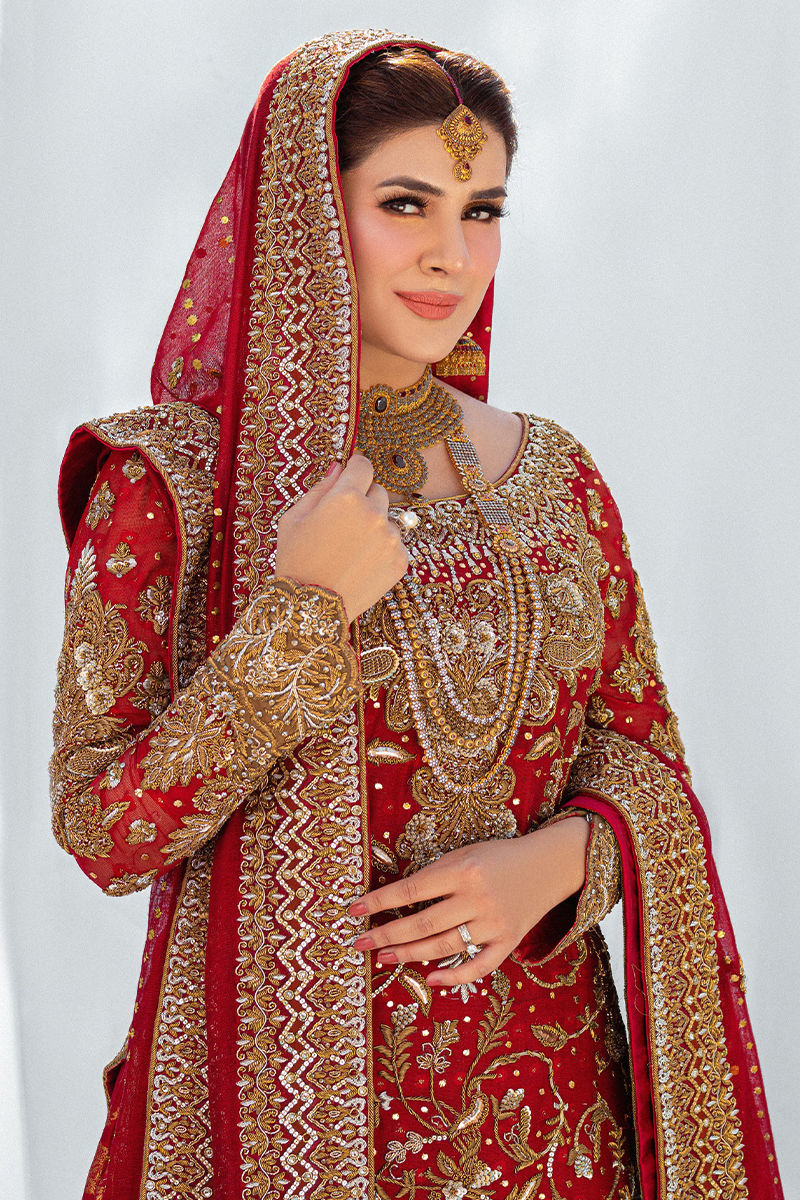 Ndulge in opulence with this deep red bridal ensemble, featuring intricate hand-crafted zardozi work on a luxurious khaddi net shirt. Paired with a rich banarsi lehenga and a khaddi net dupatta, adorned with quora, dabka, and detailed jaal borders, this look embodies the essence of timeless bridal elegance.