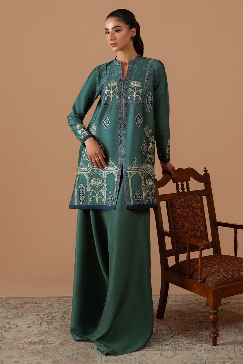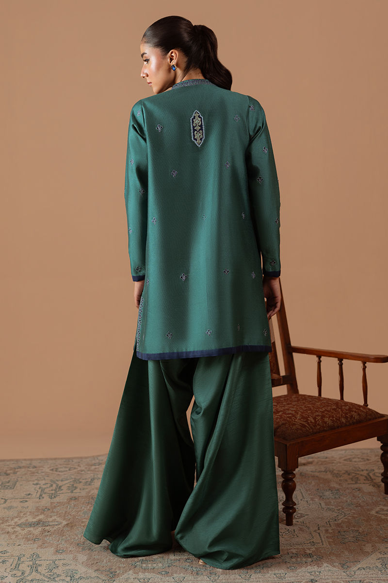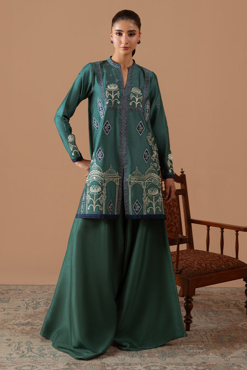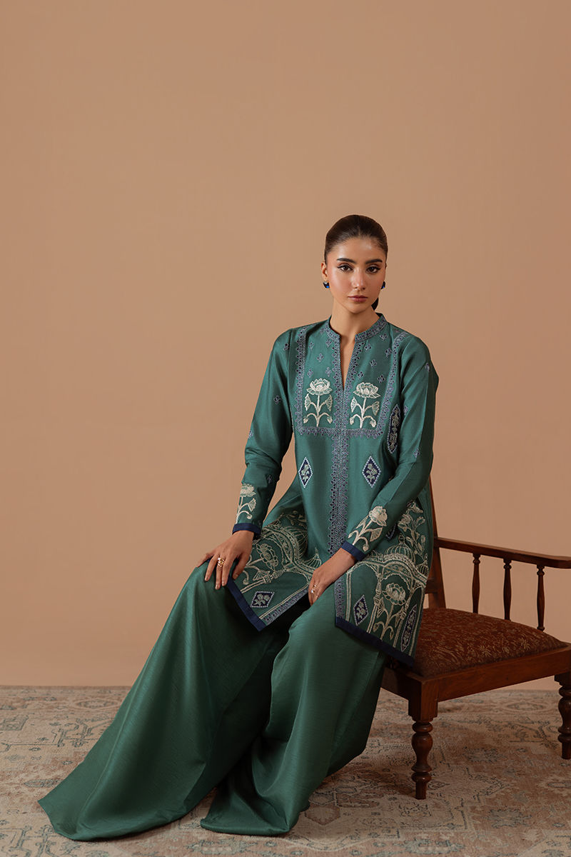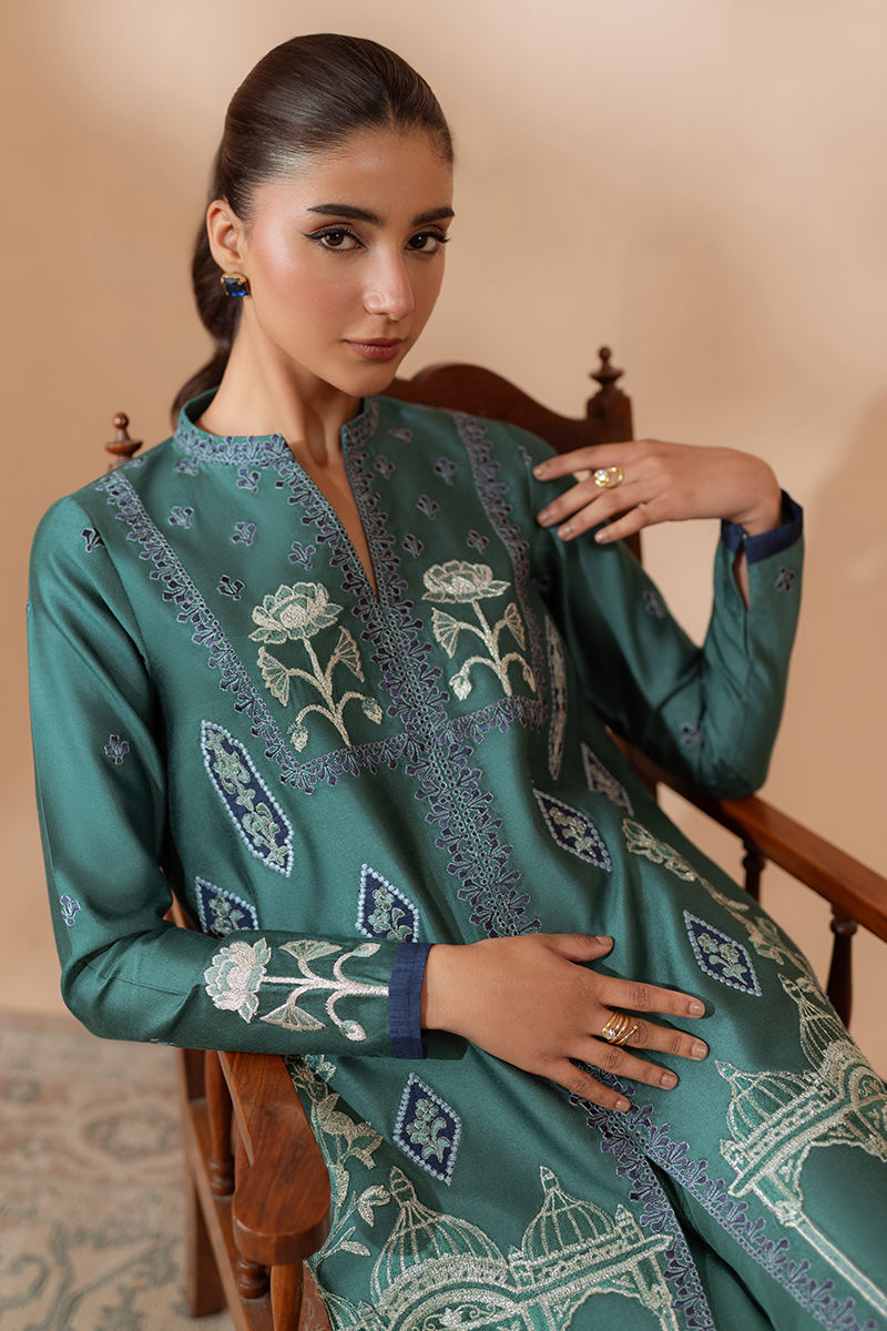 Indulge in the maximalist statement and pure class of this jewel toned teal cotton net shirt. Adorned with daring embroidery on the neckline, daman and sleeves, this outfit is sure to turn heads and make a bold statement.
