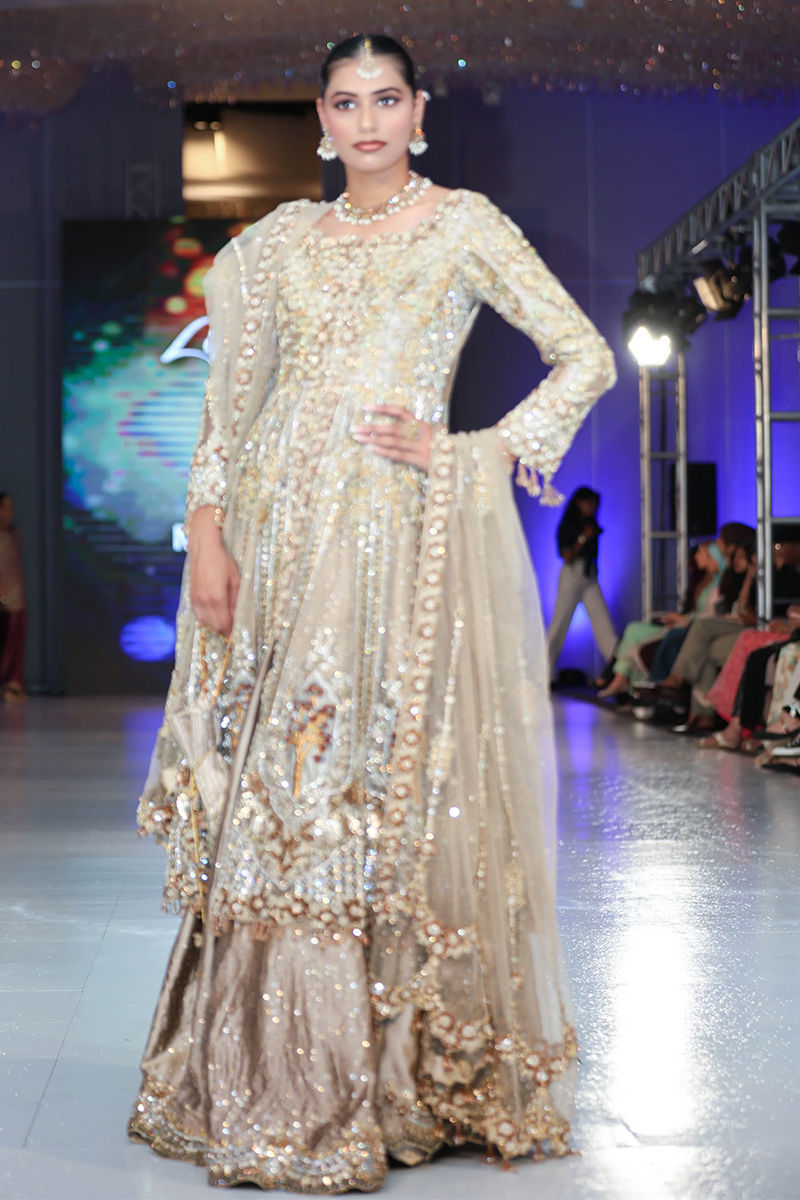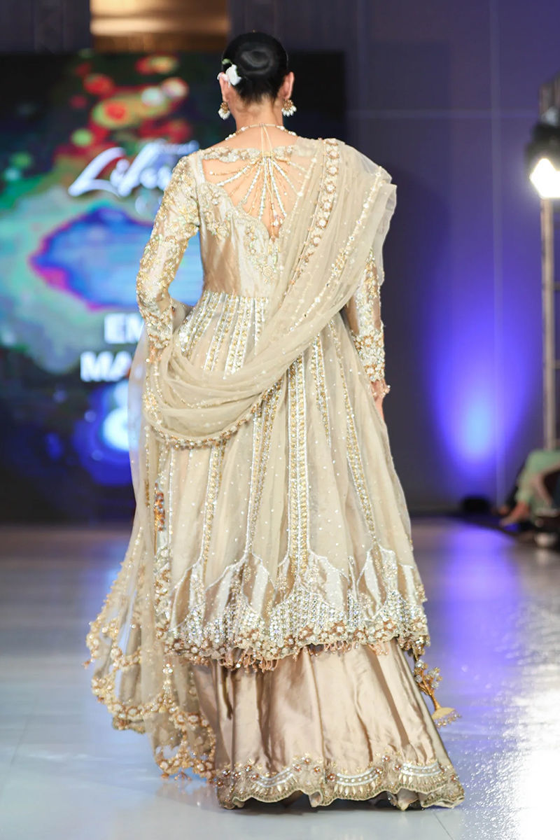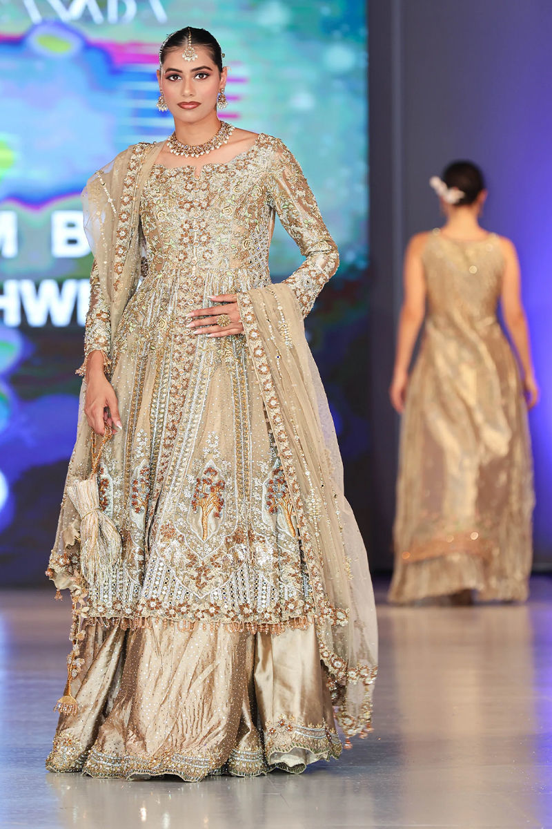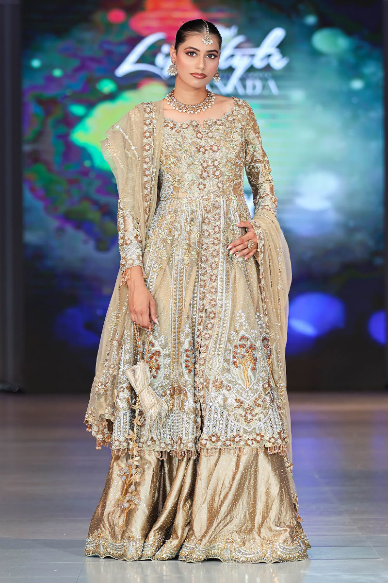 A traditional bridal lehnga with a peshwas silhouette, crafted in opulent champagne gold and muted beige tones. The ensemble features all-over hand embroidery with dabka, naqshi, mukesh, sequins, stones, and resham, while the richly detailed borders of both lehnga and shirt showcase intricate zardozi work with a 3D effect.