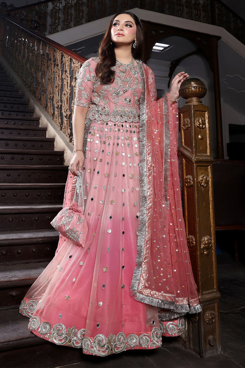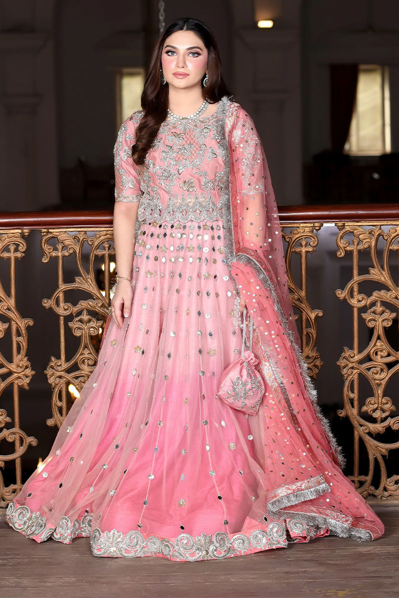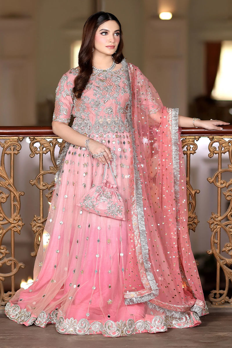 Dupatta: Pink net with silver and gold kaamdani and silver kiran. –