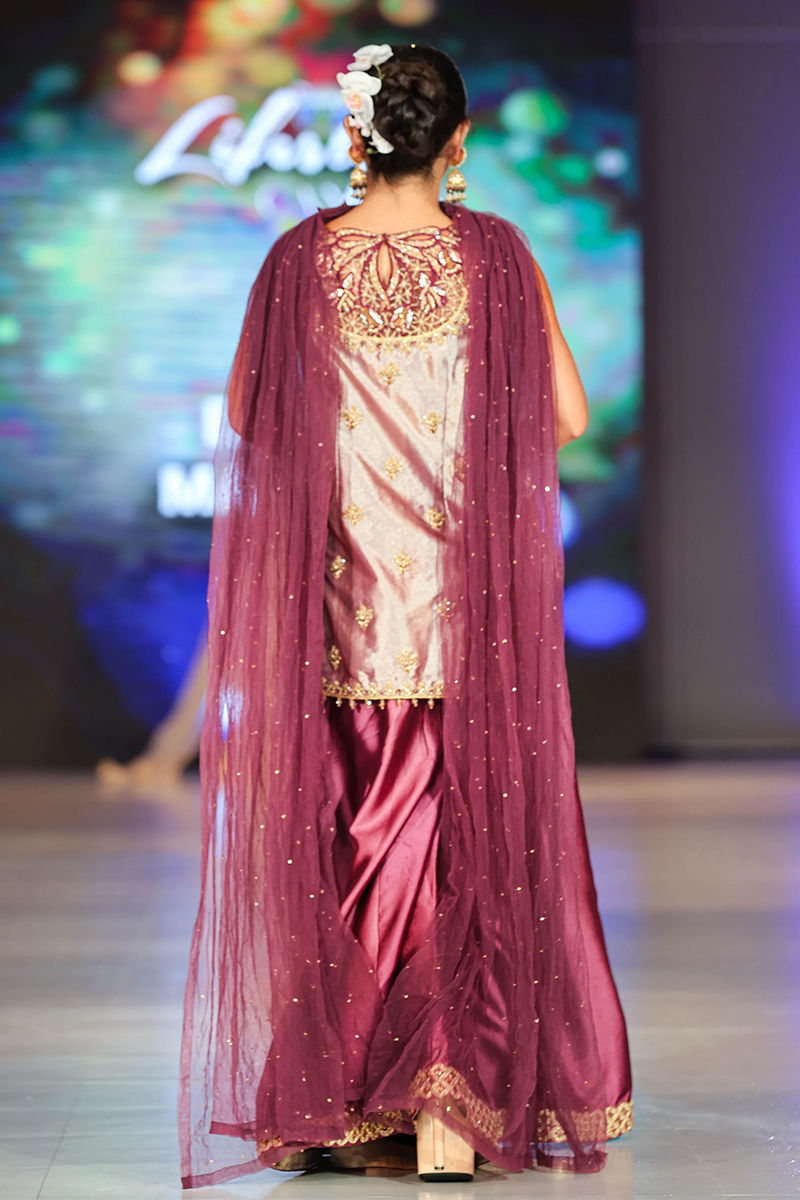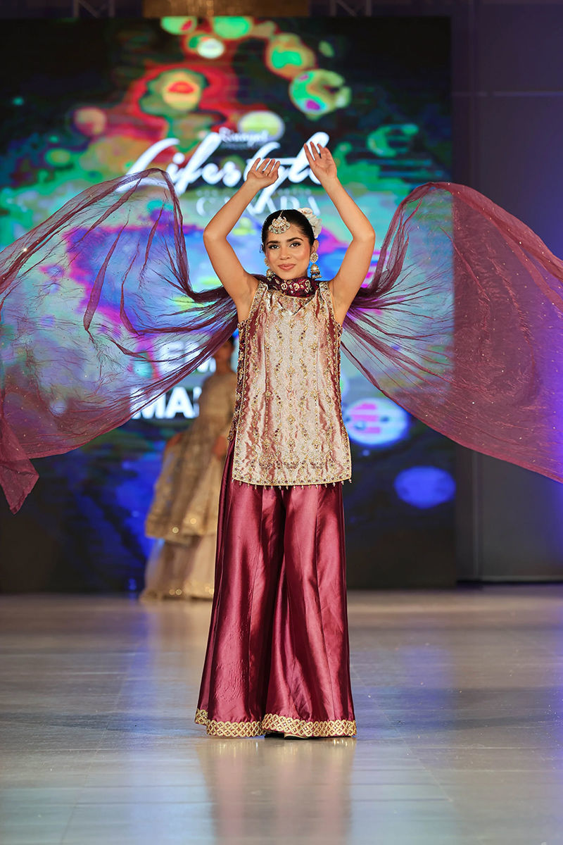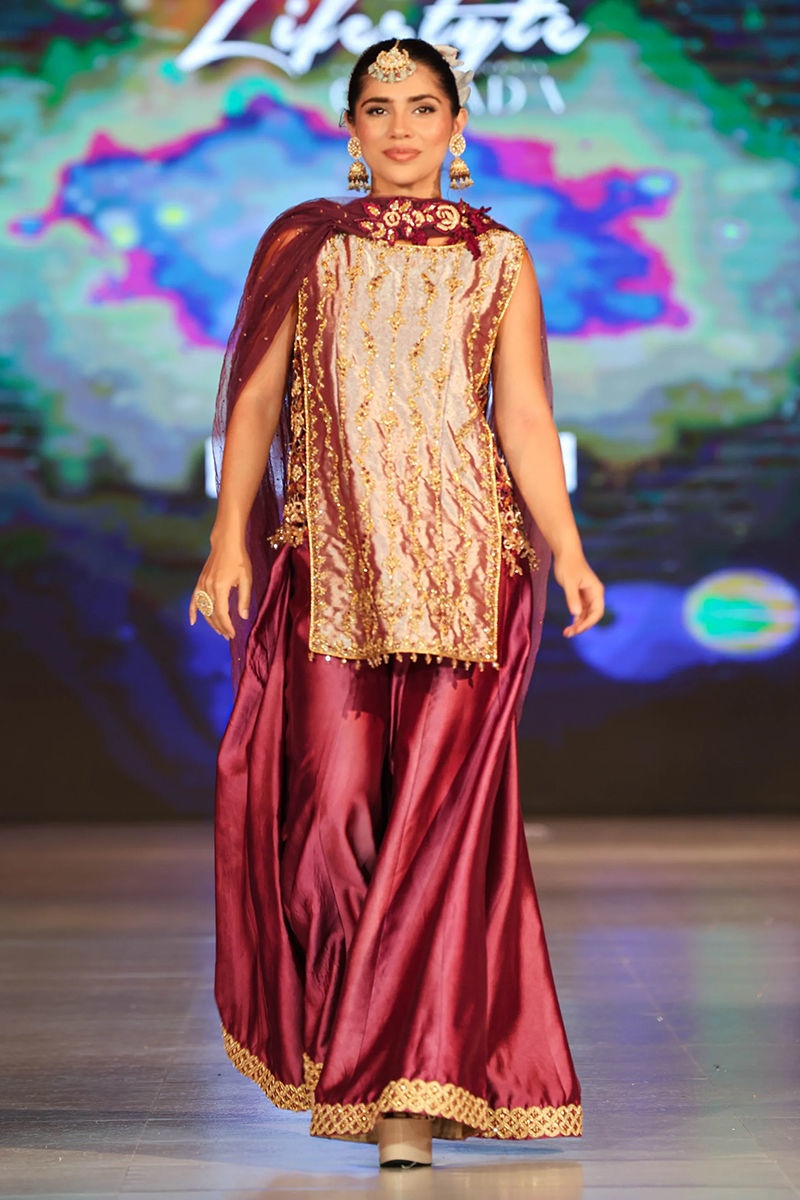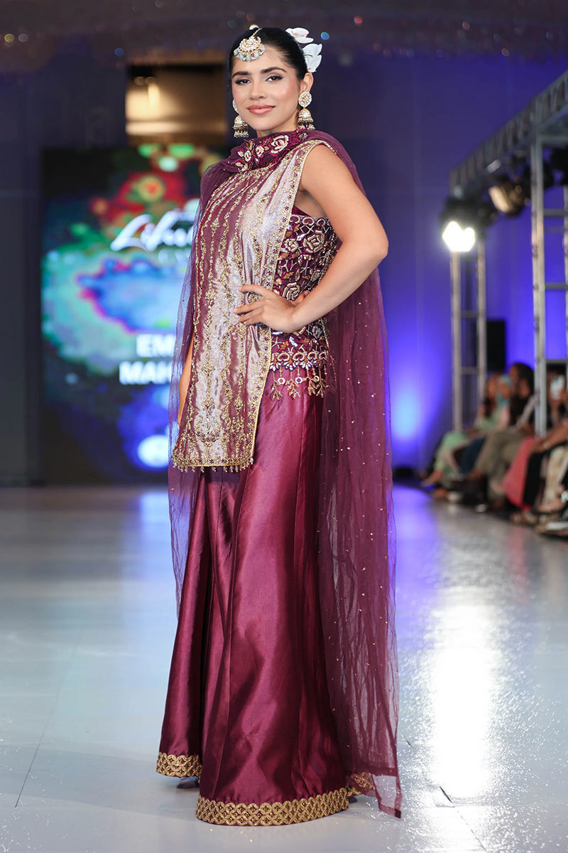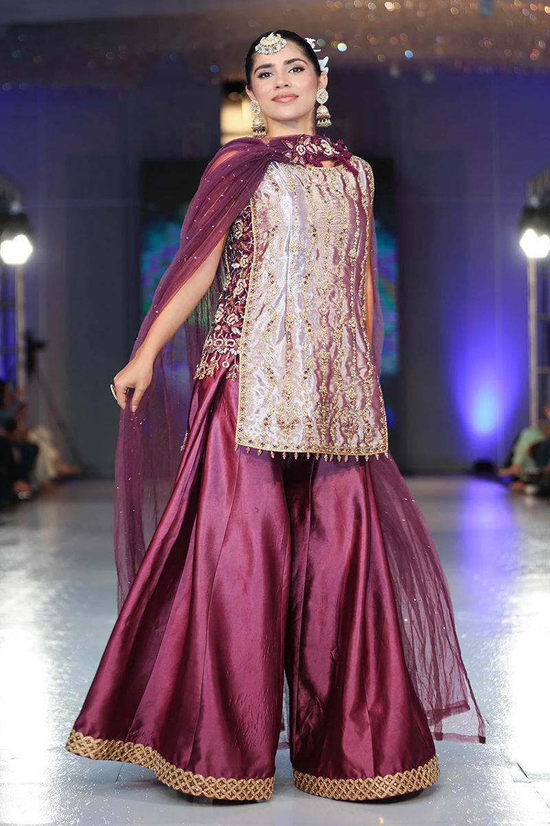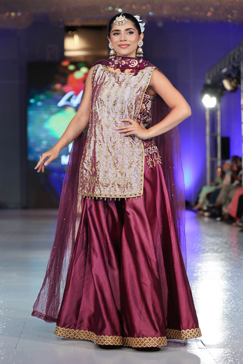 This burgundy sleeveless short shirt features exquisite hand embroidery with zardozi detailing, resham French knots, and delicate cutwork along the sides adorned with hanging tassels. It is paired with silk sharara enhanced with a tilla border and intricate hand embellishments. The look is completed with a net dupatta beautifully adorned with delicate 3D motifs.