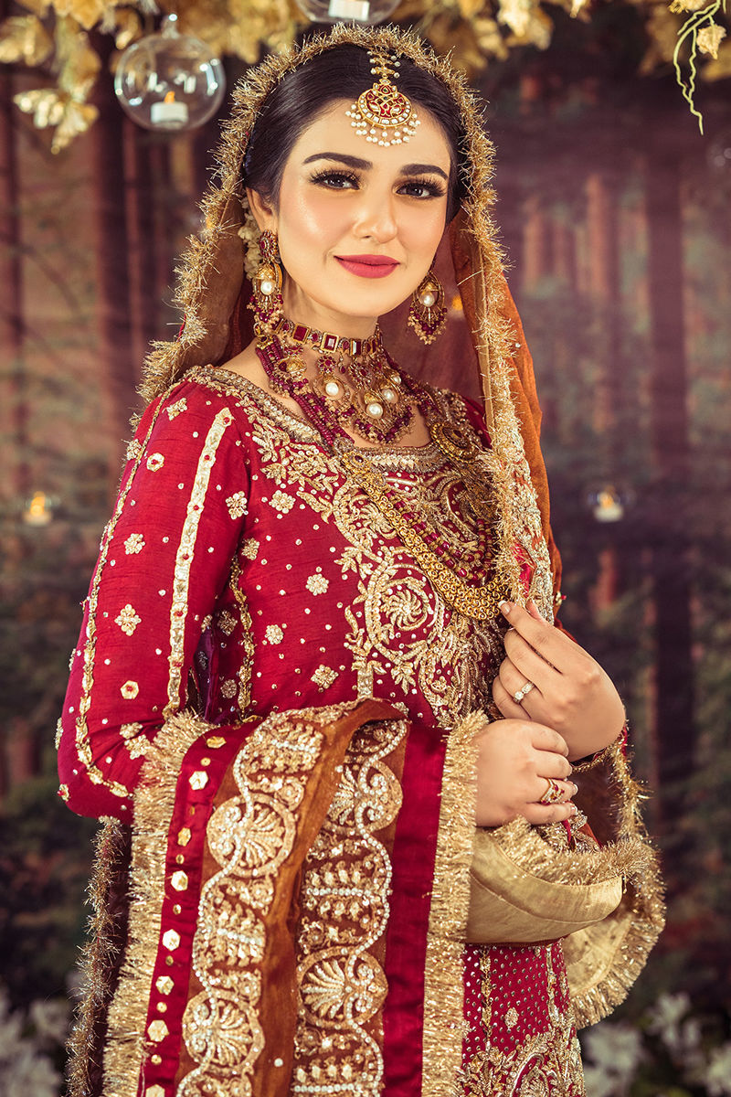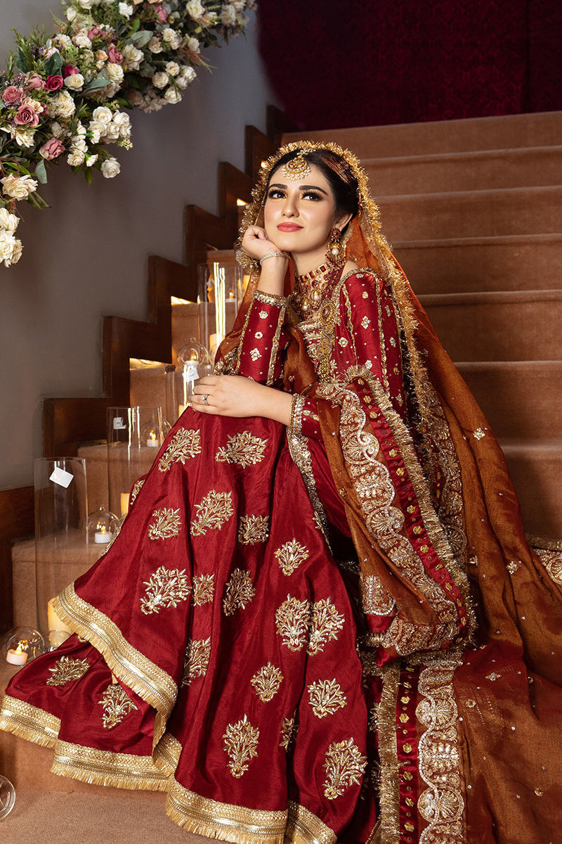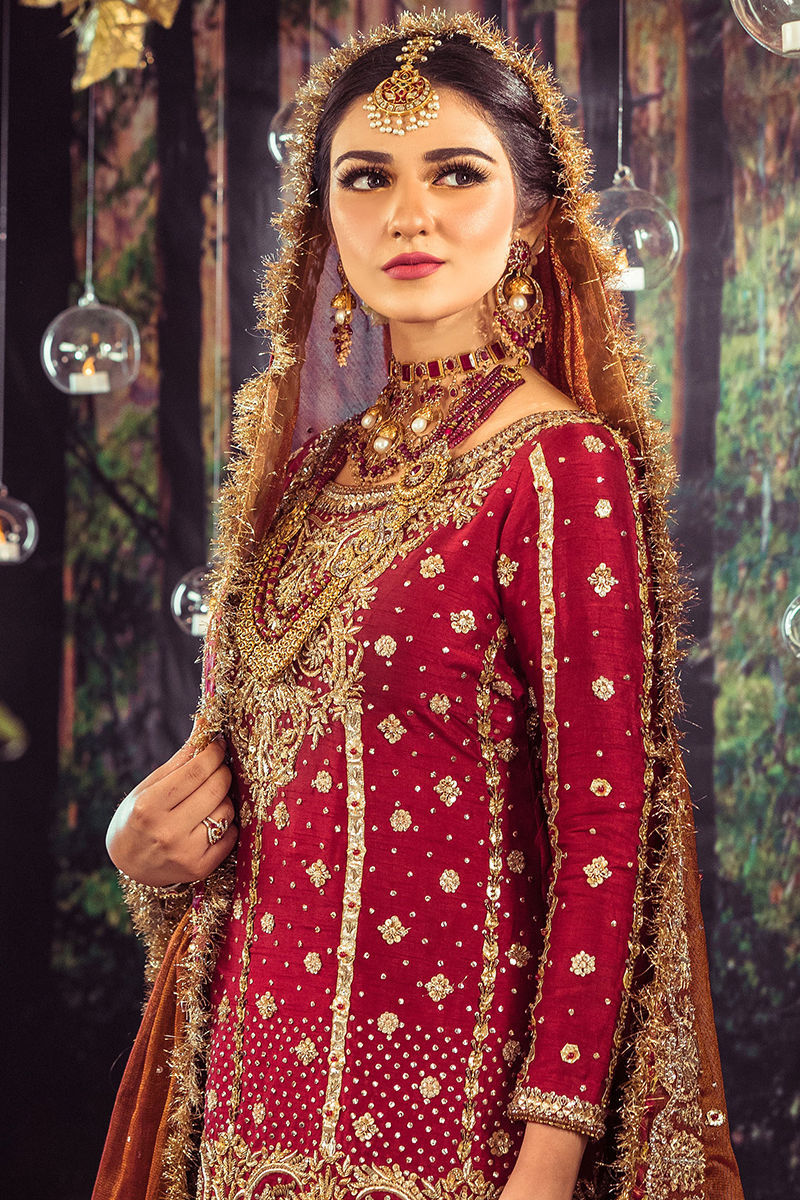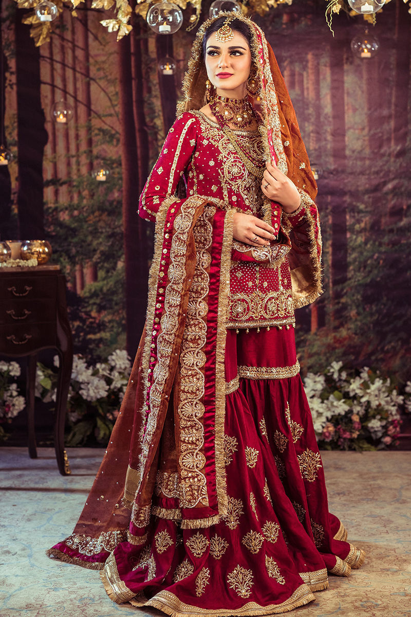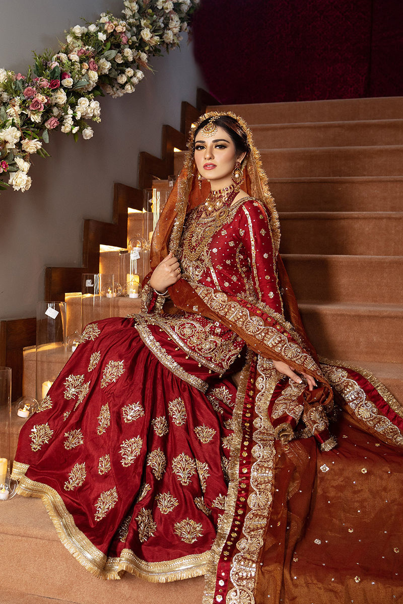 Our classic maroon bridal. A rawsilk shirt paired with a beautiful rawsilk gharara, a zari net dupatta enriched with embellished details complete this bridal ensemble.