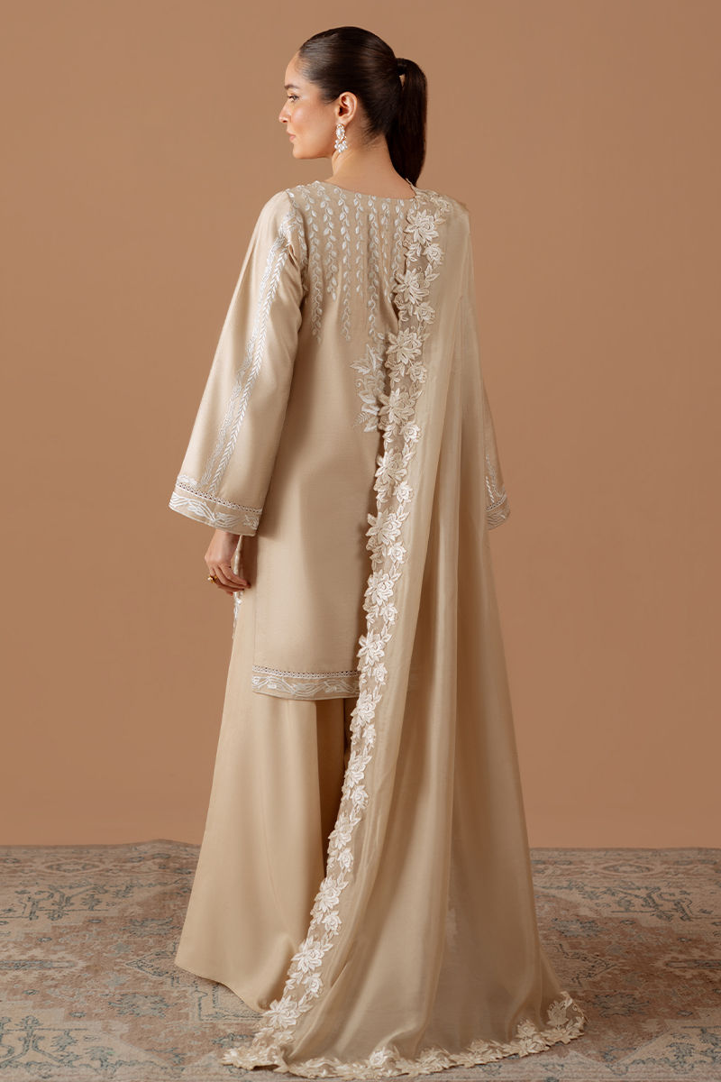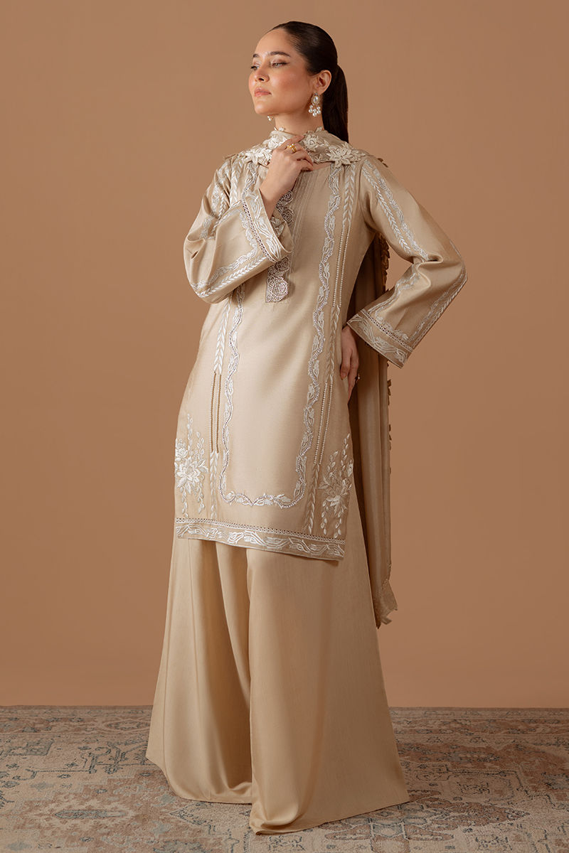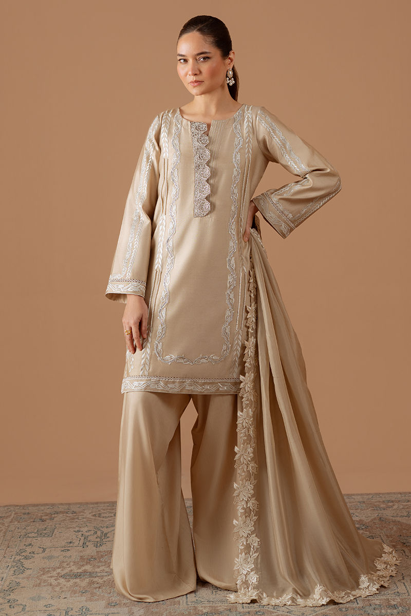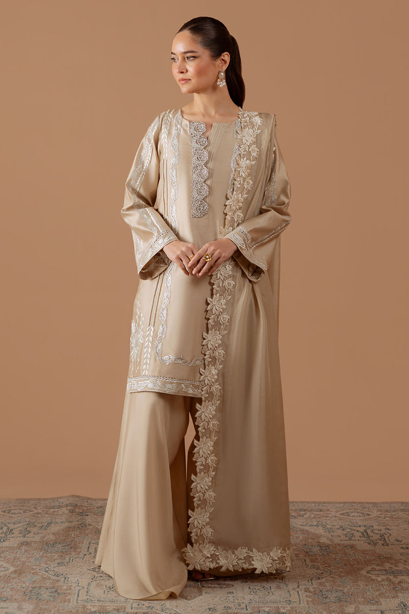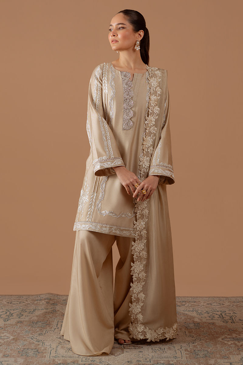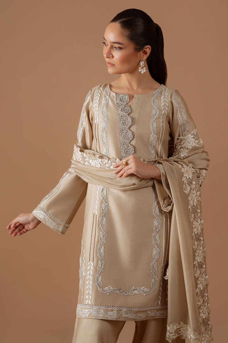 Introducing pure elegance: our beige cotton net shirt adorned with vibrant white embroidery and lace accents, perfectly paired with voluminous pants and stunningly embroidered silk dupatta for an effortlessly chic look that demands attention.