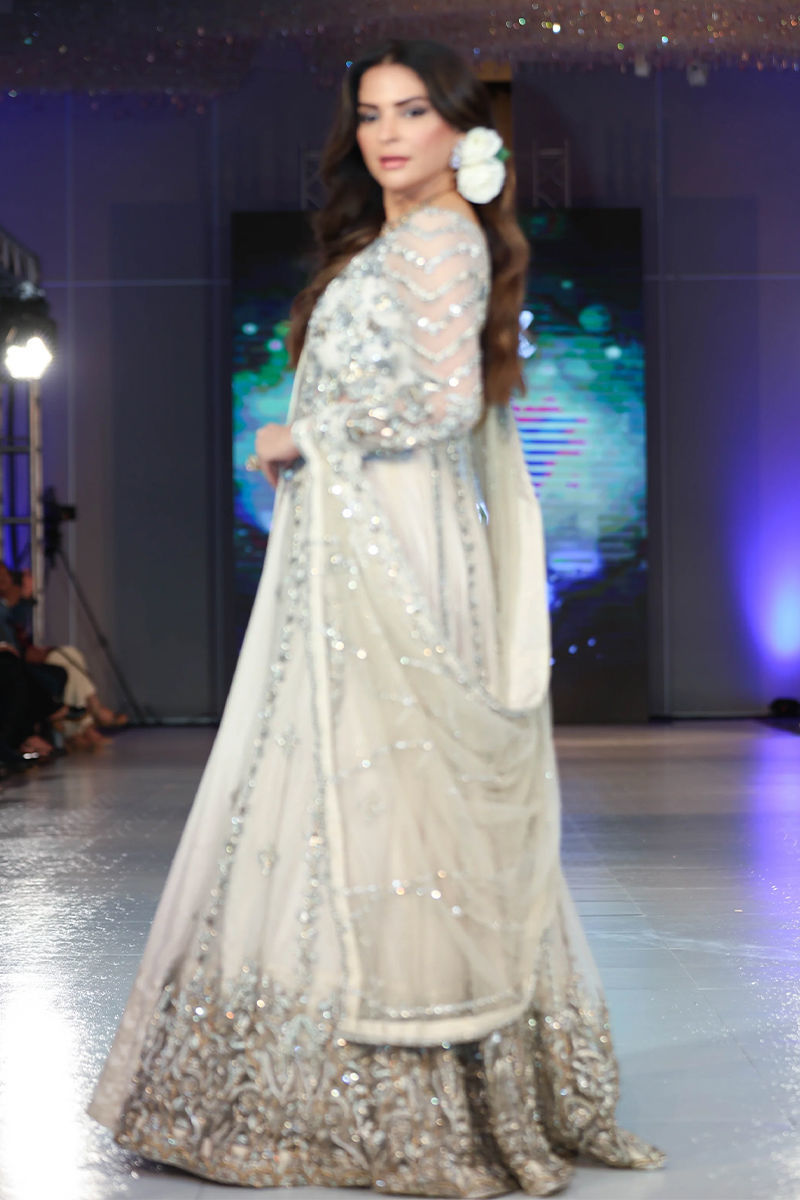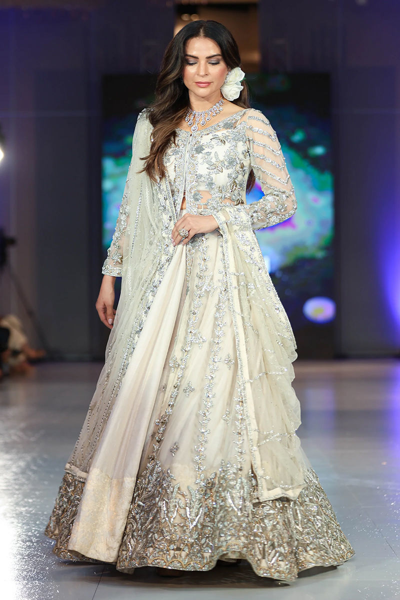 A net kalidaar front-open bridal ensemble intricately handcrafted with zardozi, gota, naqshi, dabka, mukesh, and tilla work. It is styled with a raw silk lehnga accentuated by a luxurious jamawar border, while the net dupatta is adorned with exquisite embellishments and a four-sided zardozi border, completing this regal masterpiece.