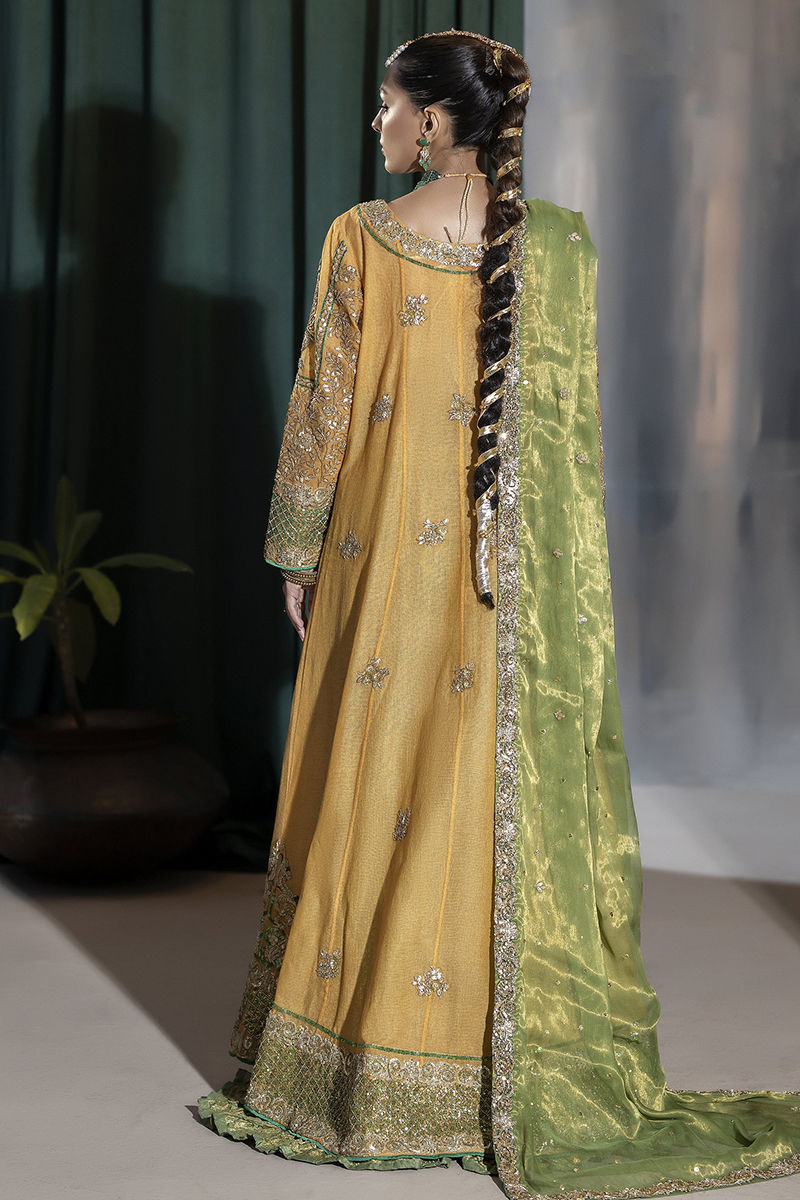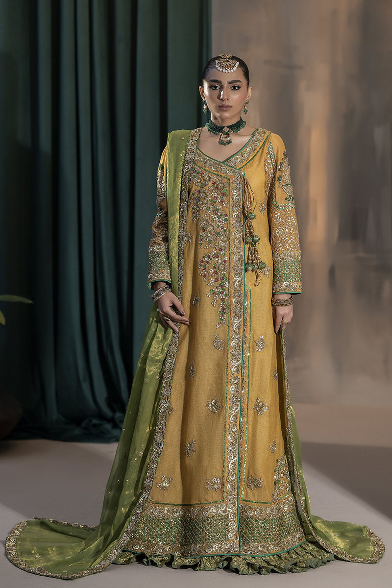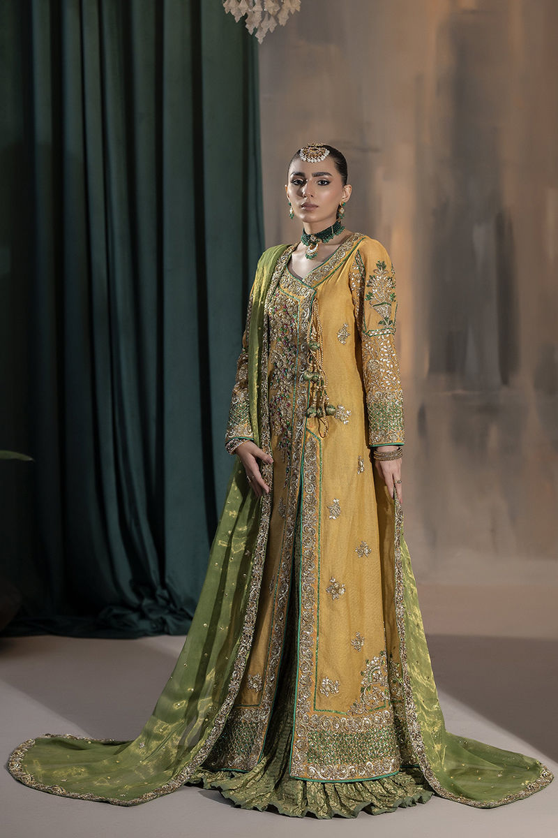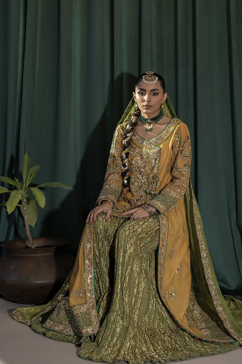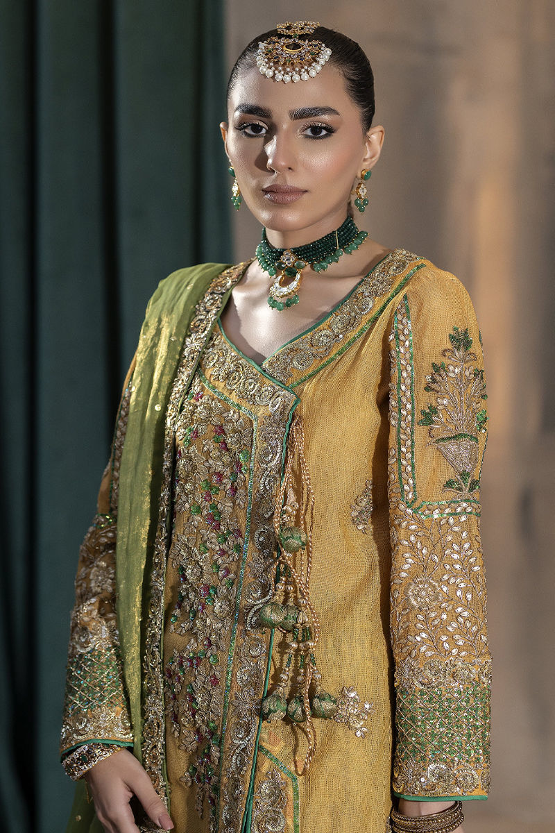 Stepping into tradition with a touch of timeless elegance . A vibrant yellow cotton net angrakha flows gracefully, complemented by a rich green jamawar gharara that speaks of heritage and artistry. The matching green dupatta adds the perfect finishing touch, creating a harmonious blend of colours and textures.