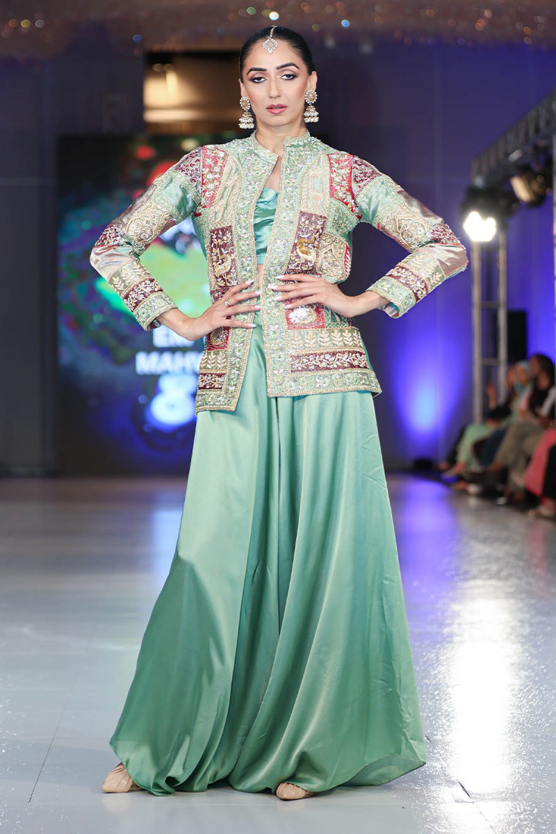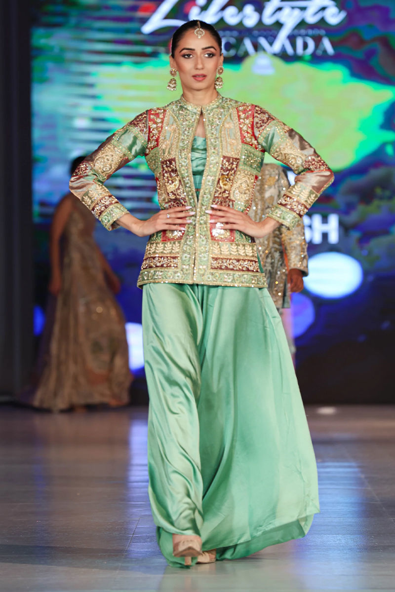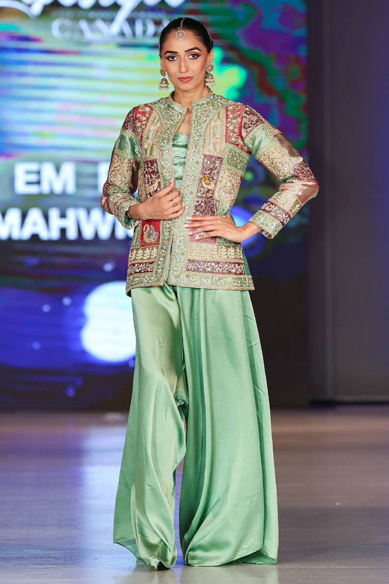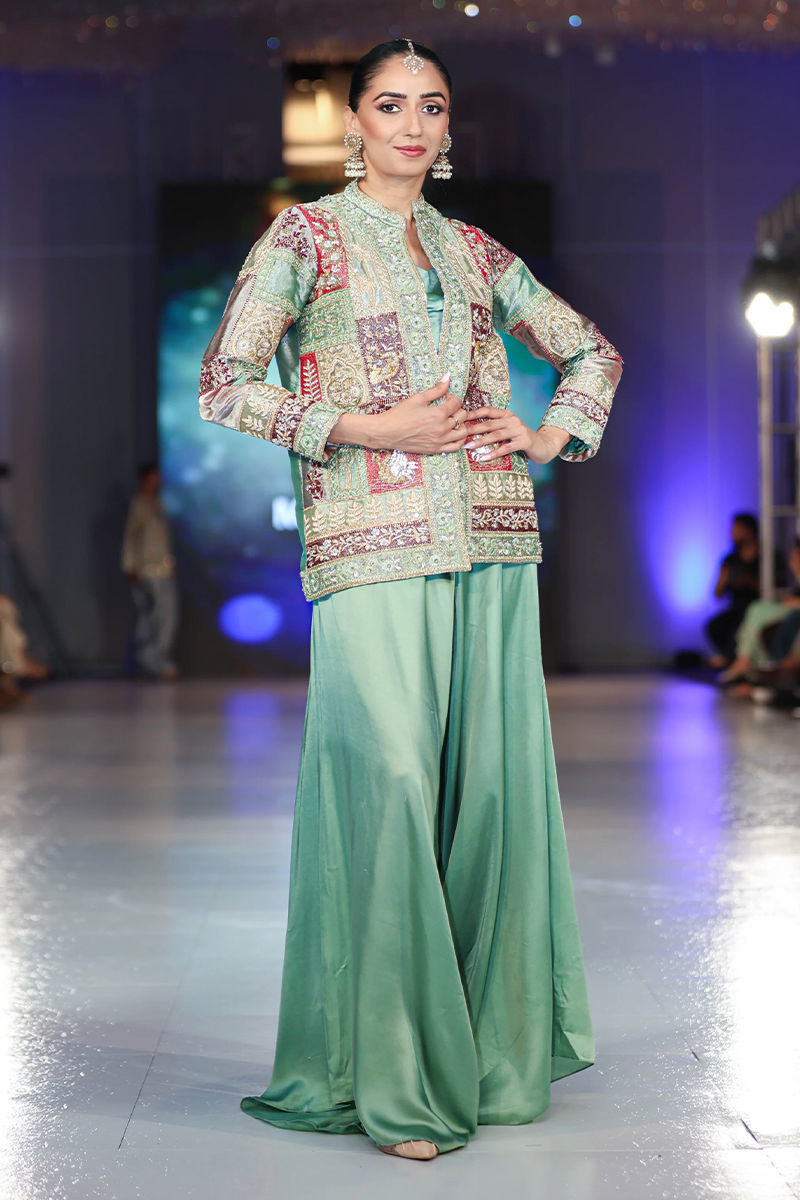 An exquisite expression of modern luxury, this jacket is crafted from multi-colored tissue and adorned with intricate zardozi work. Enhanced with sequins, crystals, Kamdaani, vibrant resham, and delicate motifs, it reflects artistry at its finest. Paired with flared charmouse silk pants, this ensemble exudes elegance with a contemporary edge.