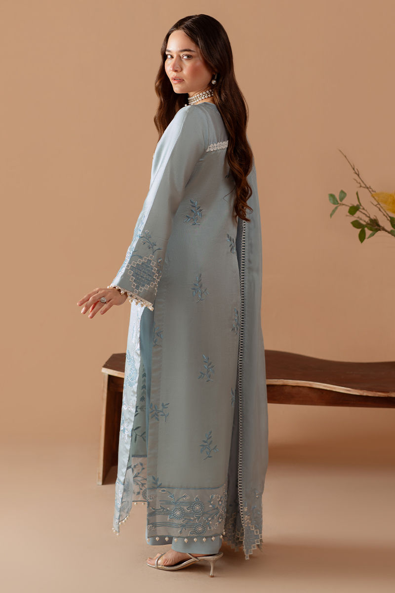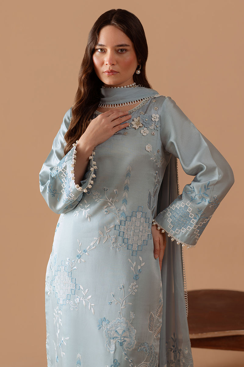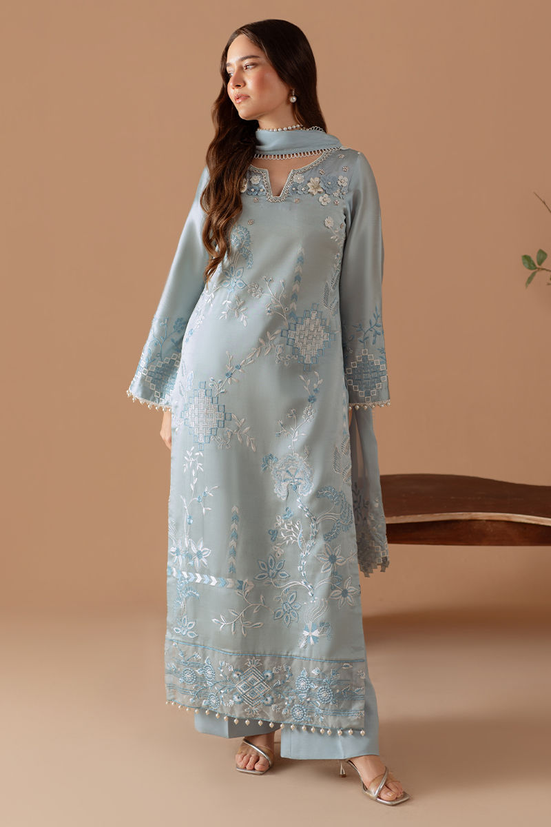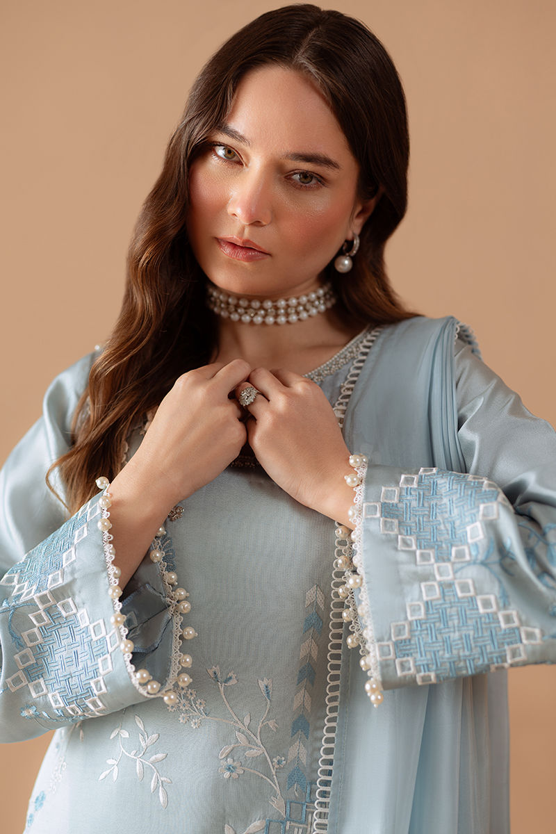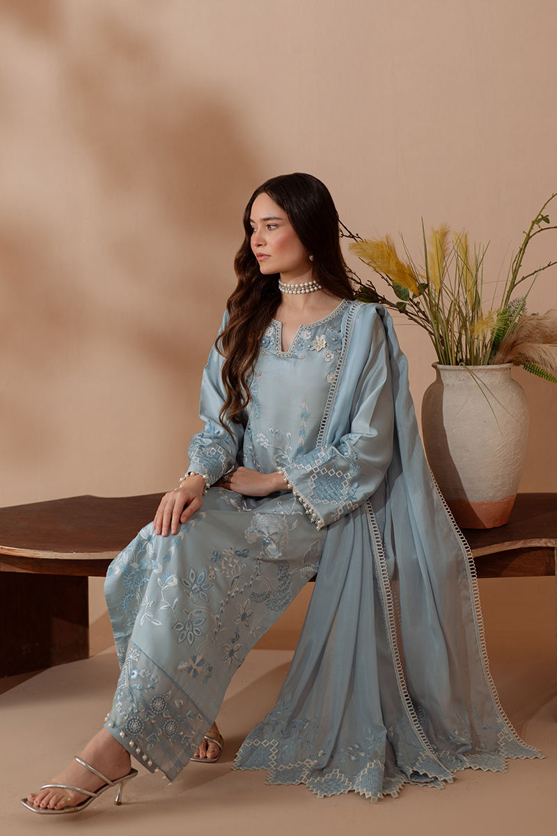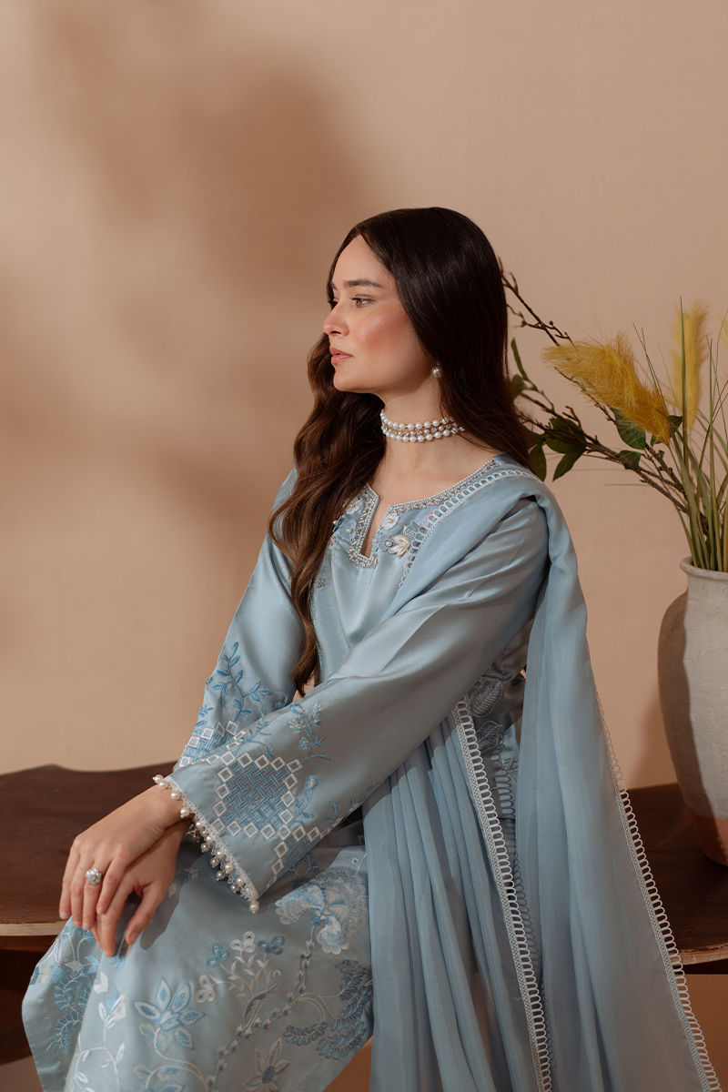 Fresh, serene, and effortlessly graceful — this ice blue ensemble is a celebration of soft elegance. The tissue silk shirt features intricate 3D florals, pearls and embroidery scattered delicately across the silhouette, creating a light, airy look. Paired with raw silk pants, the outfit feels polished while remaining comfortable. A flowing silk dopatta completes the set for a dreamy finish. Perfect for daytime festivities, summer soirées, and refined celebrations where understated beauty shines.