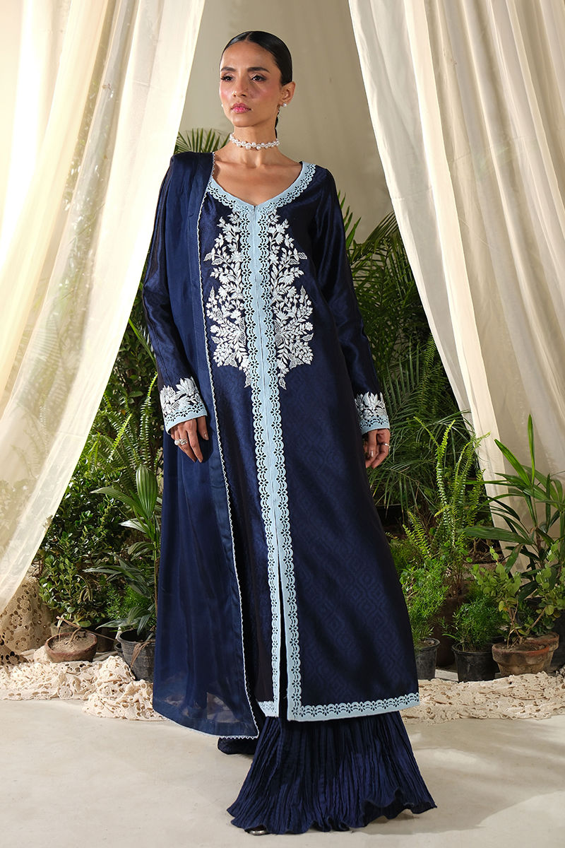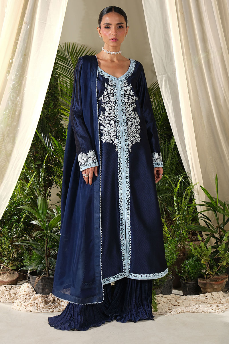 A timeless navy blue ensemble crafted in self silk, featuring delicate embroidery and lace detailing. The front open shirt is paired with sleek silk pants and a matching dupatta, creating a look that is effortlessly elegant and refined.