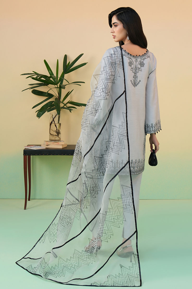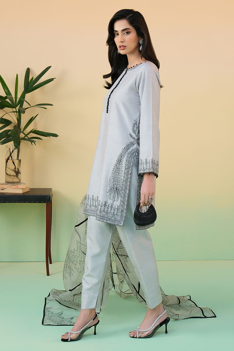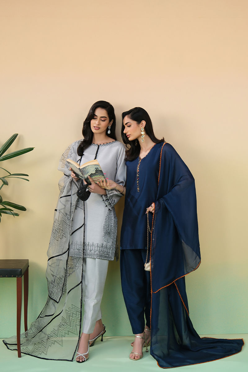 Elevate your wardrobe with this serene steel grey ensemble, designed with understated elegance in mind. The shirt features delicate black embroidery beautifully complimented by the beaded black trim on the neckline and sleeves. Paired with a matching shalwar for a seamless silhouette, the look is completed with a sheer organza dupatta adorned with striking monochrome block print patterns. Refined, graceful, and effortlessly sophisticated - this piece is perfect for intimate gatherings and elegant Eid moments.
