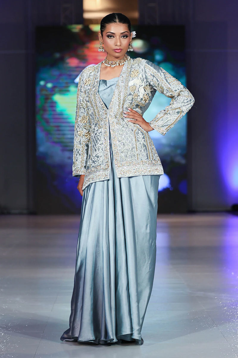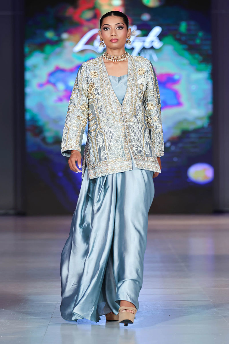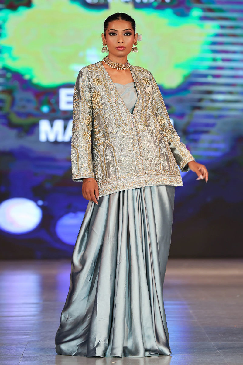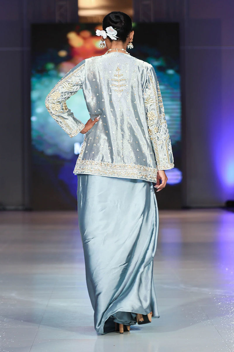 Delicate yet fierce, this jacket reflects a spirit of quiet strength in our signature style. Adorned with intricate qora, dabka, crystals, sequins, and detailed zardozi work, the jacket is further elevated with graceful swan motifs. It is paired with a draped charmouse silk skirt, completing the look with modern elegance.