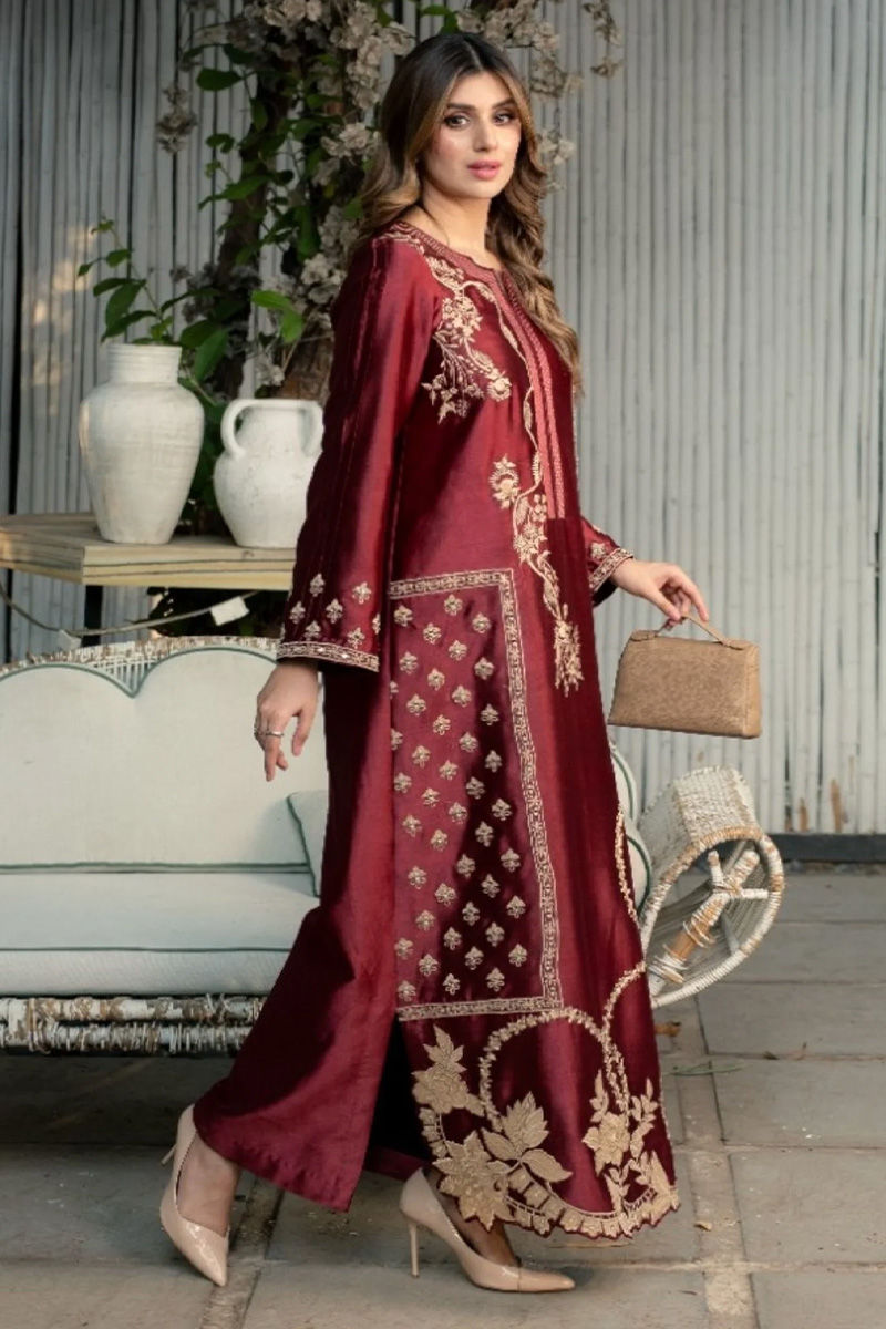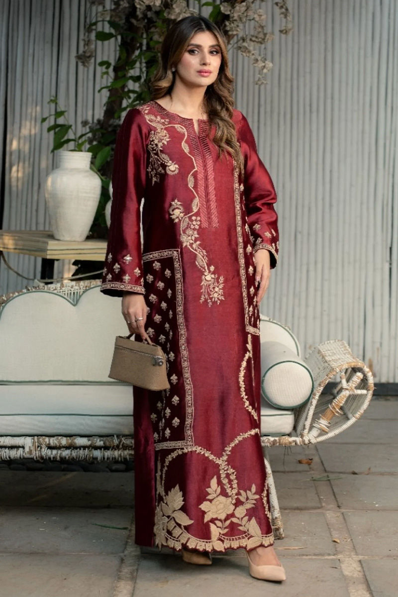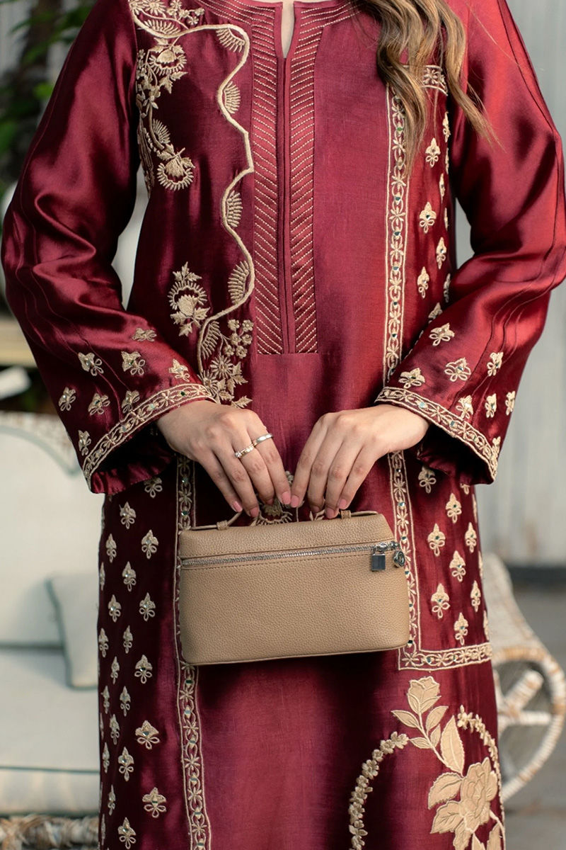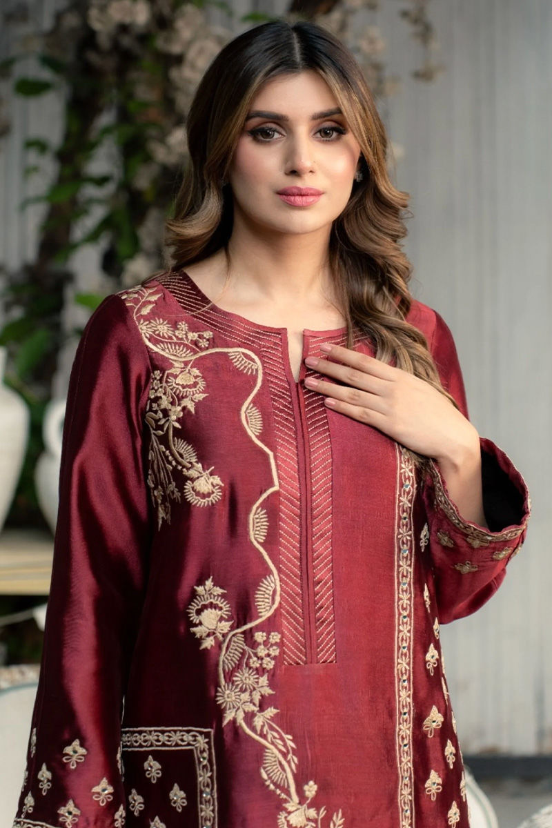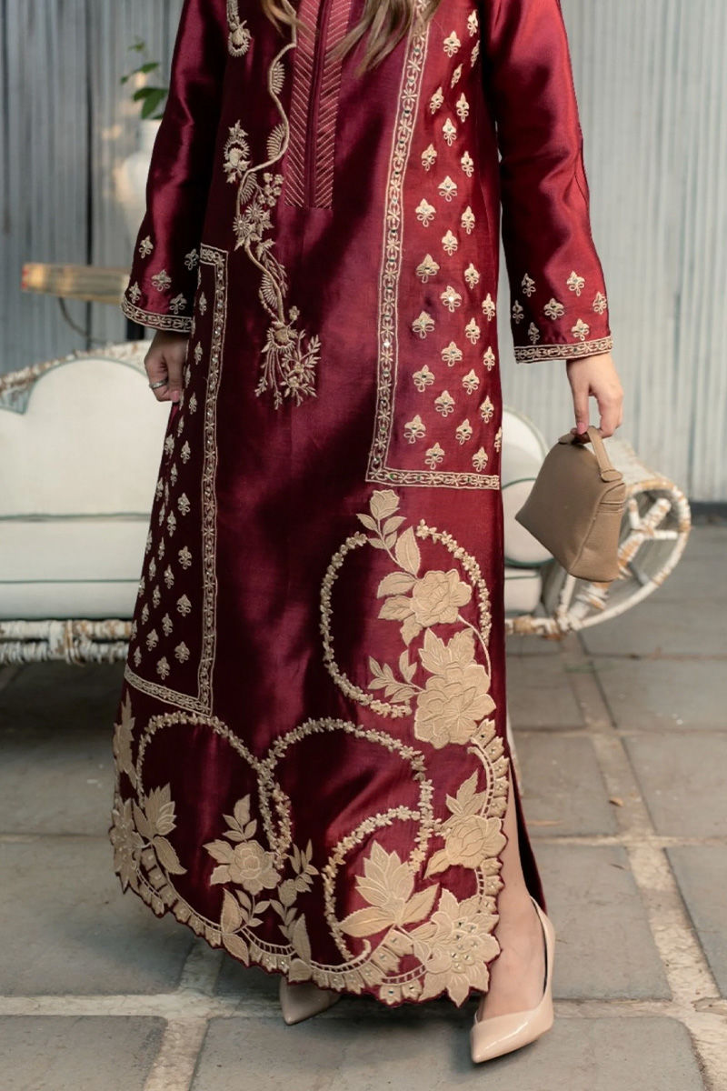 Draped in a rich maroon hue, this tissue silk kaftan-style shirt is beautifully adorned with ivory applique work featuring delicate botanical patterns, Reflecting the beauty of handmade work.
