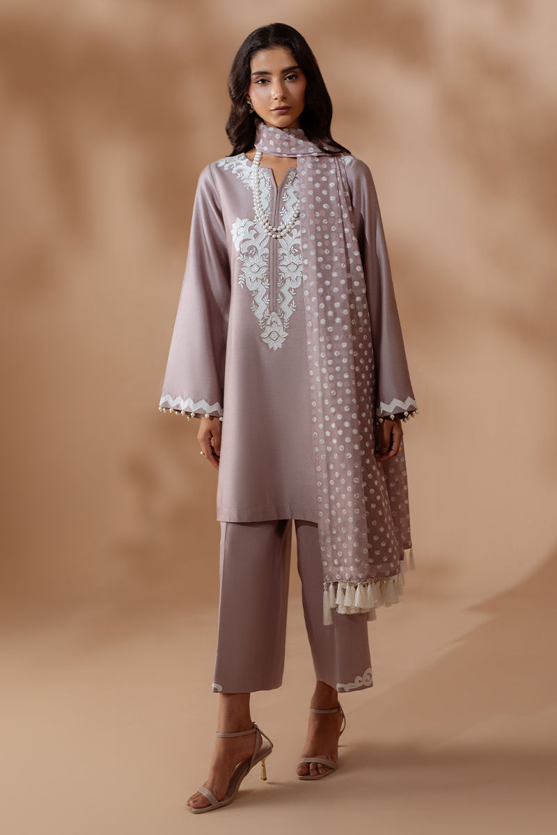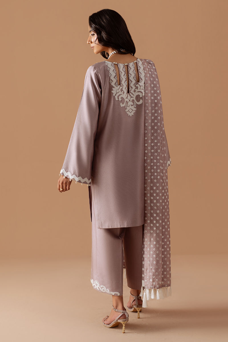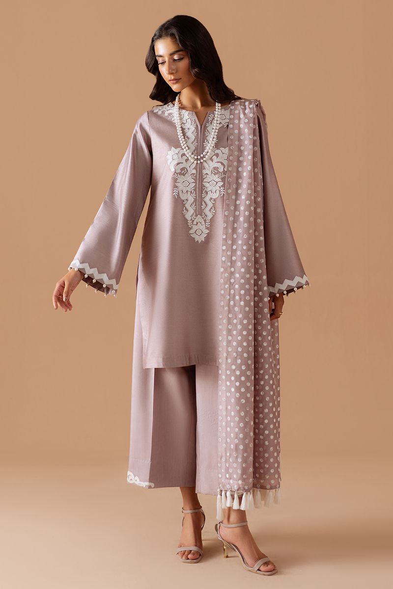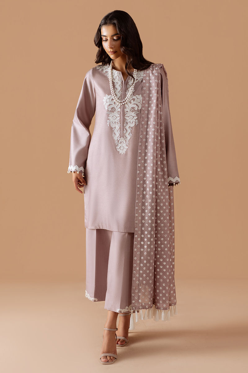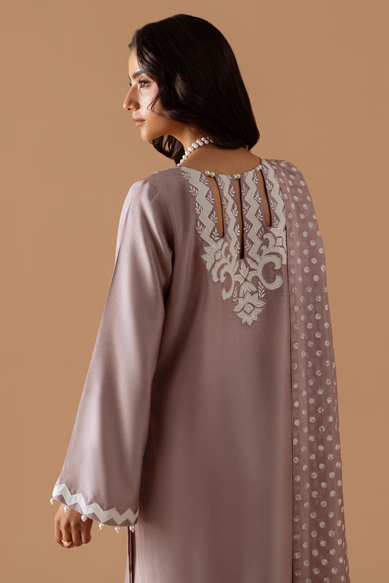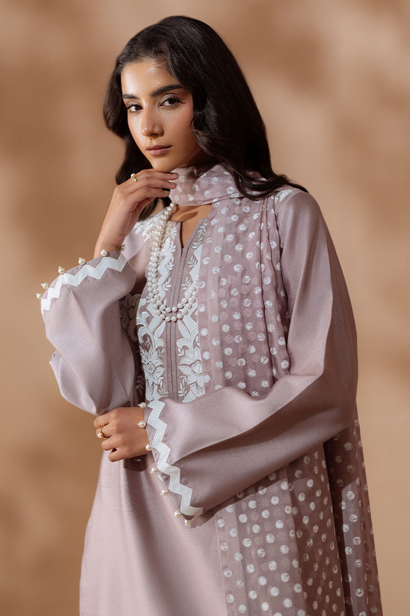 A timeless silhouette rendered in a soft mauve hue, this luxury pret ensemble embodies understated Eid elegance. The cotton net shirt is adorned with intricate embroidery, lending a refined artisanal touch. Subtle detailing at the sleeves adds depth while maintaining a clean, contemporary finish. Paired with cotton silk straight pants and patterned silk dupatta, the look strikes a perfect balance between tradition and modernity. Effortlessly graceful, this ensemble is designed for festive mornings and intimate Eid gatherings, where sophistication speaks quietly yet confidently.