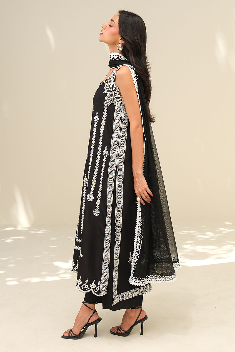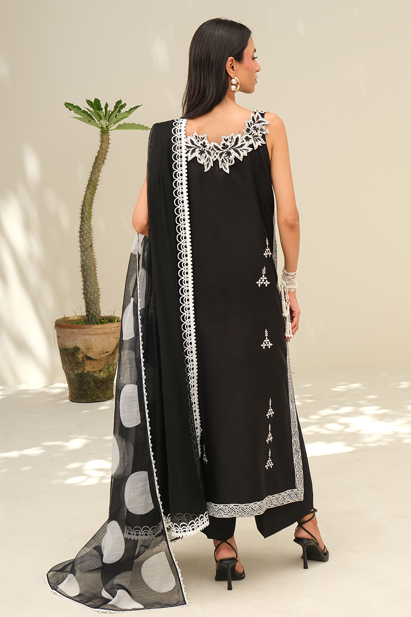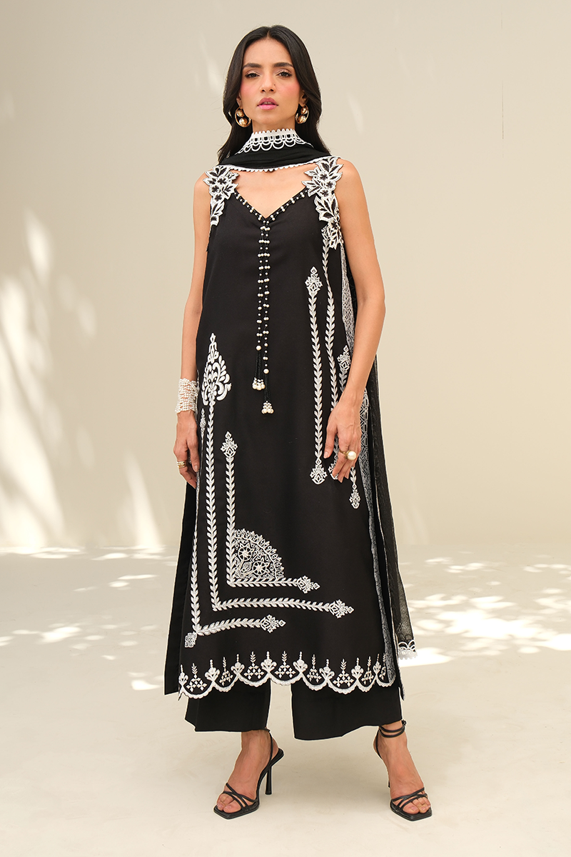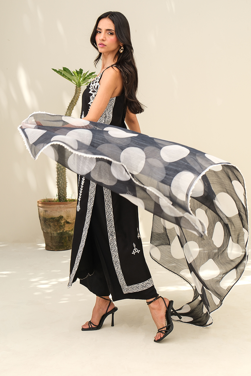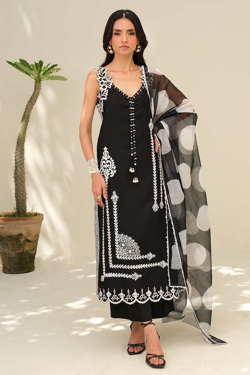 A timeless black ensemble brought to life with intricate embroidery and refined block print, finished with delicate beadwork along the neckline. Effortlessly elegant with just the right touch of statement.